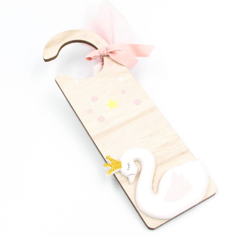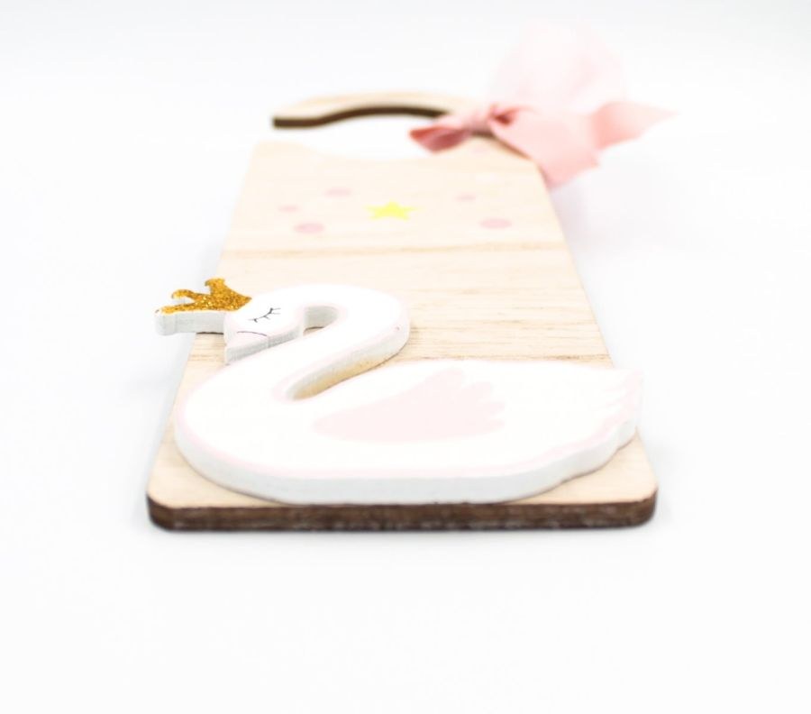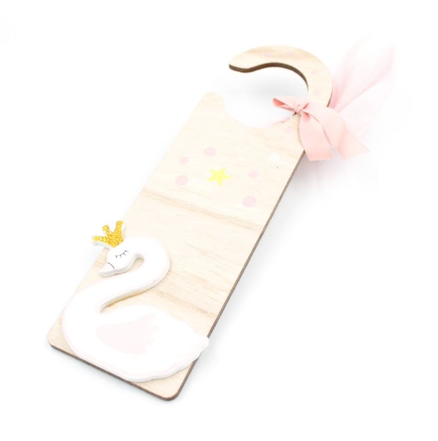 Μπομπονιέρα βάπτισης ξύλινο πινακάκι πόρτας με θέμα τον κύκνο.