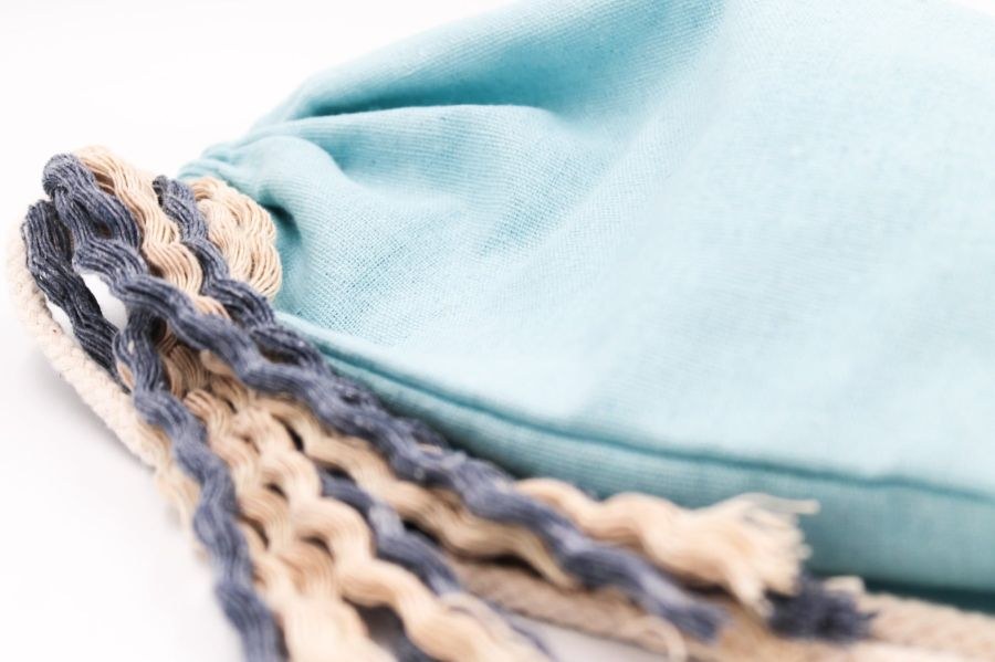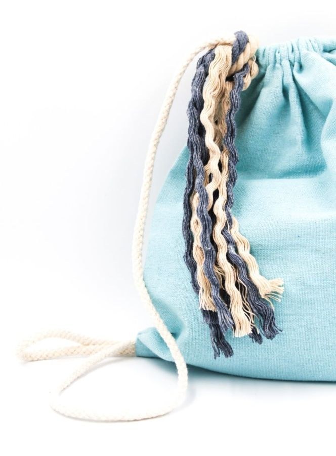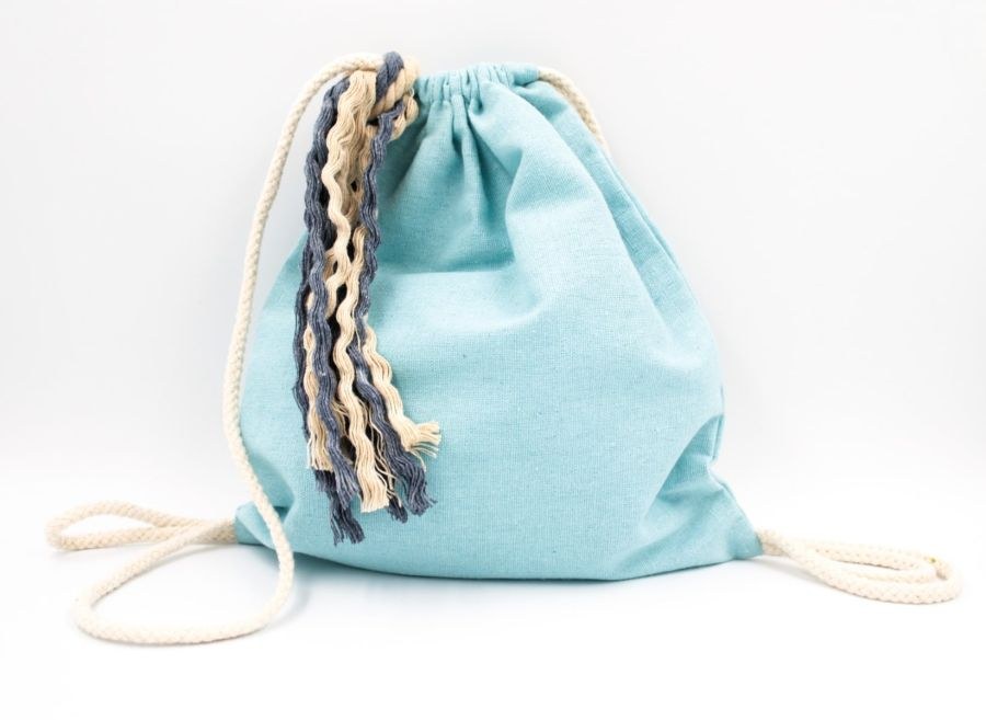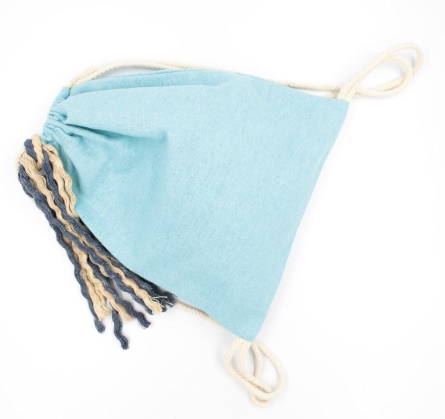 Μπομπονιέρα πουγκί πλάτης σε σιέλ χρώμα με κορδόνια μπλε με μπεζ.