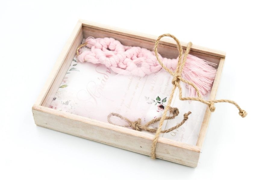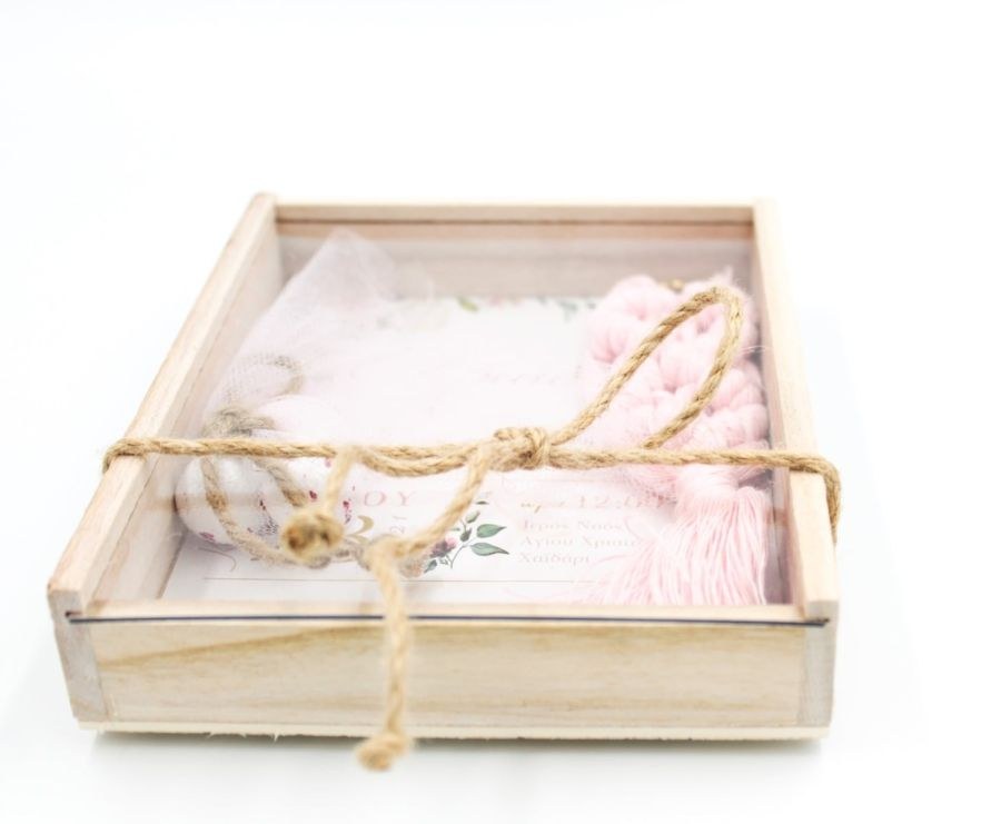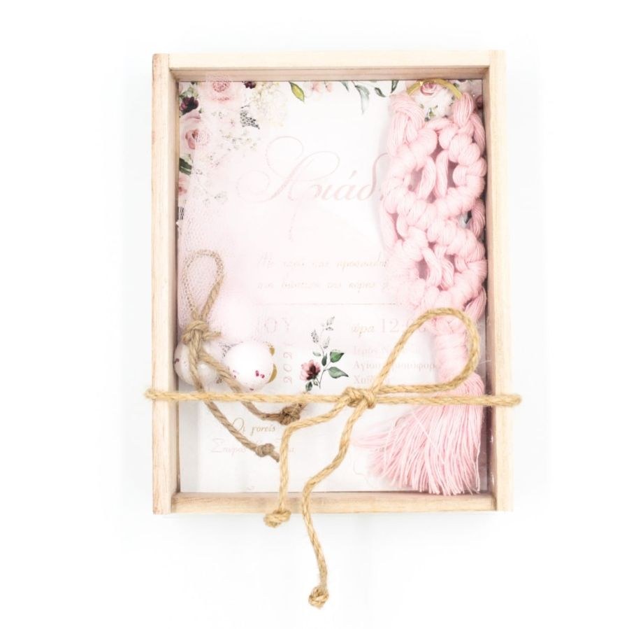 Μπομπονιέρα - προσκλητήριο βάπτισης σε κουτί ξύλινο με συρταρωτό plexiglass καπάκι, εσωτερική εκτύπωση προσκλητηρίου και μακραμέ μπρελόκ.