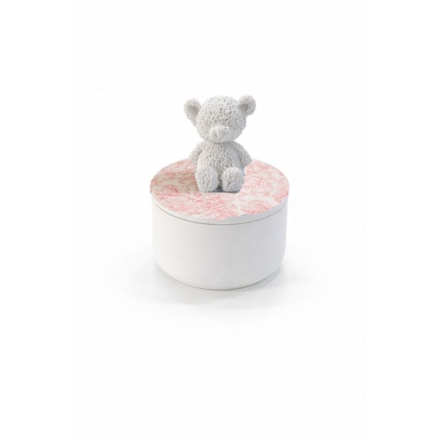 Το προϊόν διακρίνεται για την εξαιρετική ποιότητα κατασκευής του, ξεκινώντας από τη στιβαρή κυλινδρική βάση σε καθαρό λευκό ματ κεραμικό. Το καπάκι αποτελεί το κεντρικό στοιχείο αισθητικής, καθώς κοσμείται από ένα περίτεχνο floral print σε απαλές ροζ αποχρώσεις, το οποίο παραπέμπει σε κλασικά γαλλικά μοτίβα "toile de jouy". Στην κορυφή δεσπόζει ένα ανάγλυφο λευκό αρκουδάκι με ιδιαίτερη πλεκτή υφή, που προσδίδει βάθος και μια μοναδική αίσθηση χειροποίητου στο αντικείμενο. Η αρμονία των χρωμάτων και η ποιότητα του φινιρίσματος υπογραμμίζουν τον premium χαρακτήρα αυτής της ιδιαίτερης μπομπονιέρας.