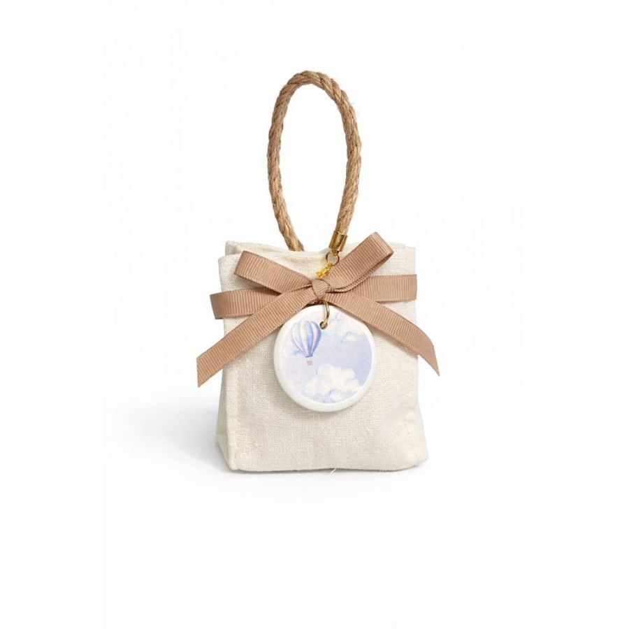 Το τσαντάκι είναι κατασκευασμένο από ανθεκτικό ύφασμα σε φυσική ιβουάρ απόχρωση, με μια διακριτική ανάγλυφη πλέξη που τονίζει τον οργανικό του χαρακτήρα. Το ιδιαίτερο χερούλι από φυσικό σχοινί προσδίδει μια ρουστίκ πινελιά και επιτρέπει στη μπομπονιέρα να φορεθεί στον καρπό ως «βραχιόλι», κάνοντας την παρουσίαση της τελετής σας πιο διαδραστική και μοντέρνα. Στο κέντρο δεσπόζει ένας πλούσιος φιόγκος από κορδέλα γκρο σε γήινη μπεζ-taupe απόχρωση, από τον οποίο κρέμεται ένα λευκό κεραμικό στρογγυλό στοιχείο με χρυσό κούμπωμα. Το print απεικονίζει ένα αερόστατο σε απαλές σιέλ και βιολετί αποχρώσεις να ταξιδεύει πάνω από χνουδωτά σύννεφα, δημιουργώντας ένα καλλιτεχνικό αποτέλεσμα που θυμίζει υδατογραφία.