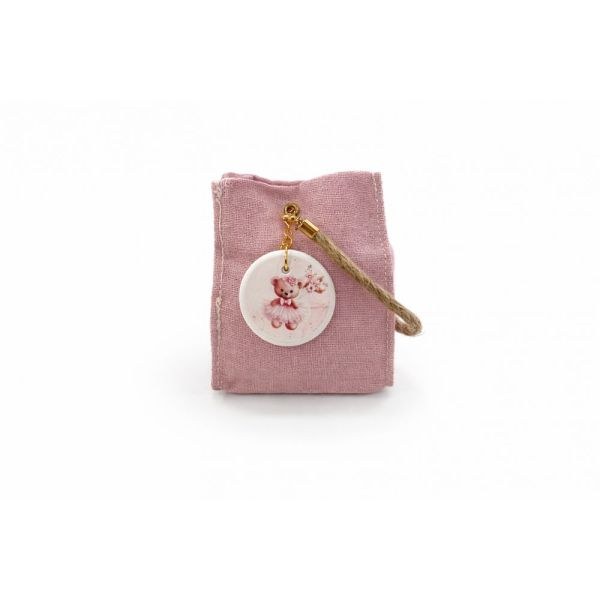 Το τσαντάκι είναι κατασκευασμένο από ανθεκτικό, ποιοτικό ύφασμα σε μια υπέροχη παλαιωμένη ροζ απόχρωση (dusty rose), με εμφανή πλέξη που προσδίδει οργανική υφή και βάθος. Το ιδιαίτερο χερούλι από φυσικό σχοινί δίνει έναν ιδιαίτερο χαρακτήρα "βραχιολιού", επιτρέποντας στη μπομπονιέρα να κρατηθεί με χάρη ή να κοσμήσει τον καρπό των καλεσμένων σας. Το κεντρικό διακοσμητικό στοιχείο είναι μια λευκή κεραμική πλάκα σε στρογγυλό σχήμα, η οποία κρέμεται από χρυσό κρίκο και αλυσίδα, προσφέροντας μια διακριτική λάμψη. Πάνω της απεικονίζεται ένα χαριτωμένο αρκουδάκι-μπαλαρίνα με ροζ tutu και λουλούδια, δημιουργώντας ένα οπτικό αποτέλεσμα που αποπνέει ρομαντισμό και φινέτσα.