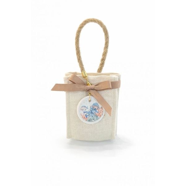 Το τσαντάκι είναι φιλοτεχνημένο από εξαιρετικής ποιότητας ύφασμα σε φυσική ιβουάρ απόχρωση, με μια διακριτική ανάγλυφη πλέξη που προσδίδει ρουστίκ φινέτσα. Το χαρακτηριστικό χερούλι από φυσικό σχοινί επιτρέπει στη μπομπονιέρα να κρατηθεί ως κομψό τσαντάκι ή να περαστεί στο χέρι ως βραχιόλι, προσφέροντας μια σύγχρονη εμπειρία παρουσίασης. Η σύνθεση ολοκληρώνεται με έναν προσεγμένο φιόγκο από κορδέλα γκρο σε γήινη μπεζ-ταμπά απόχρωση, από τον οποίο κρέμεται ένα λευκό κεραμικό στρογγυλό στοιχείο με χρυσές λεπτομέρειες στο κούμπωμα. Το print απεικονίζει έναν χαριτωμένο δύτη που εξερευνά τον βυθό ανάμεσα σε κοράλλια και ψαράκια, σε υπέροχες αποχρώσεις του γαλάζιου και του σομόν.