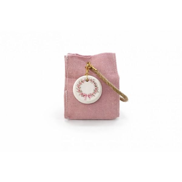 Το τσαντάκι είναι φιλοτεχνημένο από εξαιρετικής ποιότητας ύφασμα σε μια απαλή "dusty rose" απόχρωση, με πλούσια ανάγλυφη πλέξη που προσδίδει μια οργανική και premium αίσθηση. Το χαρακτηριστικό χερούλι από φυσικό σχοινί επιτρέπει στη μπομπονιέρα να φορεθεί στο χέρι ως βραχιόλι, μετατρέποντάς την σε ένα ιδιαίτερο αξεσουάρ για τους καλεσμένους σας. Το κεντρικό κόσμημα της σύνθεσης είναι ένα λευκό κεραμικό στρογγυλό στοιχείο με χρυσό δέσιμο, το οποίο φέρει ένα πανέμορφο print: ένα λεπτομερές στεφάνι από ροζ άνθη που καταλήγει σε έναν κομψό φιόγκο. Η καθαρότητα του λευκού κεραμικού σε συνδυασμό με τις παστέλ λεπτομέρειες δημιουργεί ένα οπτικό αποτέλεσμα υψηλής αισθητικής.