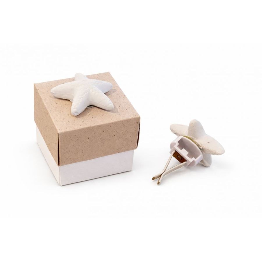 Η αισθητική του προϊόντος βασίζεται στην απόλυτη αρμονία των φυσικών τόνων και των ποιοτικών υλικών. Το αρωματικό στοιχείο είναι ένας λευκός κεραμικός αστερίας με ανάγλυφες λεπτομέρειες που μιμούνται τη φυσική υφή του πλάσματος της θάλασσας, προσδίδοντας μια αυθεντική και χειροποίητη αίσθηση. Στο πίσω μέρος, το αντικείμενο φέρει έναν εργονομικό μηχανισμό κλιπ, σχεδιασμένο να προσαρμόζεται με ευκολία και ασφάλεια στους αεραγωγούς του οχήματος. Η συσκευασία ολοκληρώνει το premium σύνολο, με ένα τετράγωνο κουτί που διαθέτει λευκή ριγέ βάση και καπάκι σε φυσική kraft απόχρωση, δημιουργώντας ένα οπτικό αποτέλεσμα που αποπνέει ηρεμία και υψηλό design.