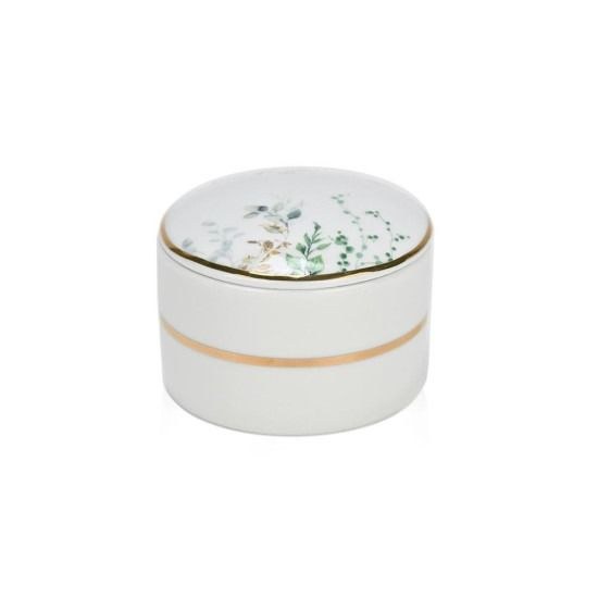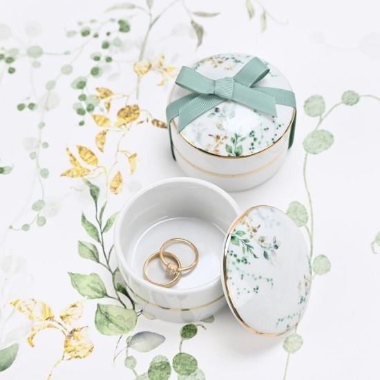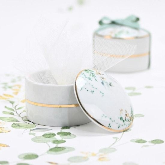 Πορσελάνινη μπιζουτιέρα με botanical σχέδιο σε αποχρώσεις του πράσινου, που φέρνει τη φρεσκάδα της φύσης σε κάθε χώρο. Η χρυσή λεπτομέρεια, από χρυσό, ολοκληρώνει την κομψή αισθητική και προσθέτει διακριτική πολυτέλεια. Μια ξεχωριστή επιλογή για να φυλάξετε κοσμήματα, κουφέτα ή μικρούς θησαυρούς, ιδανική για μπομπονιέρα γάμου ή βάπτισης, αλλά και ως δώρο.