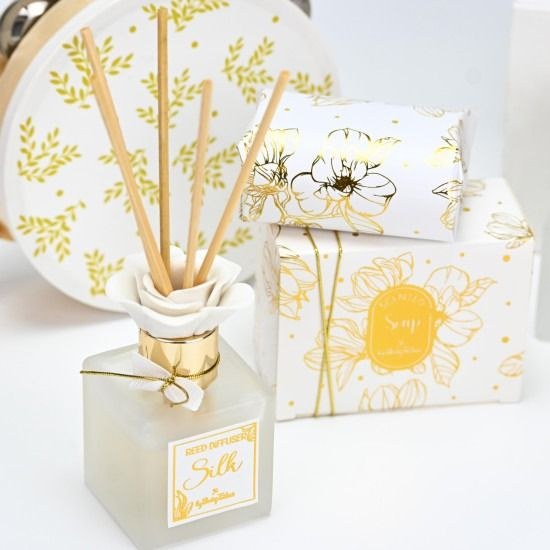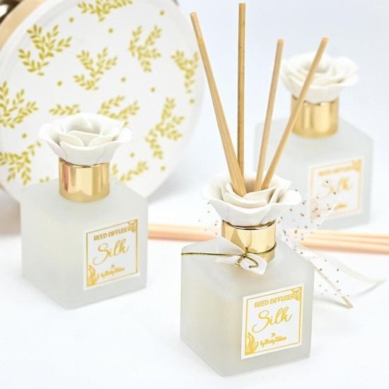 Προσθέστε μία πινελιά κομψότητας και φινέτσας στον χώρο σας με το πολυτελές αρωματικό χώρου silk 50ml. Με το εκλεπτυσμένο άρωμά του και το εντυπωσιακό κεραμικό λουλουδάκι στο καπάκι, το αρωματικό χώρου Silk είναι ιδανικό για να δημιουργήσει μία ζεστή και φιλόξενη ατμόσφαιρα. Το άρωμα του συνδυάζει τη δροσερή φρεσκάδα του περγαμόντου και του μανταρινιού με τις λουλουδάτες νότες τριαντάφυλλου, μιμόζας και ylang ylang. Η ζεστή βάση από ξύλο κασμίρ, βρύα και κεχριμπαρένιο ξύλο δημιουργεί μια αίσθηση κομψότητας και πολυτέλειας. Επιλέξτε το αρωματικό χώρου Silk για να δώσετε αξέχαστη φινέτσα σε κάθε περίσταση!