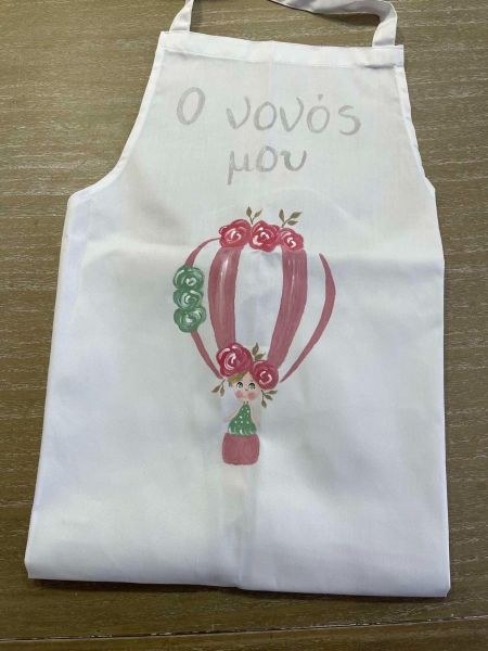 Ποδιά νονού ζωγραφισμένη στο χέρι θεματικά με αερόστατο σε αποχρώσεις του σάπιου μήλου!