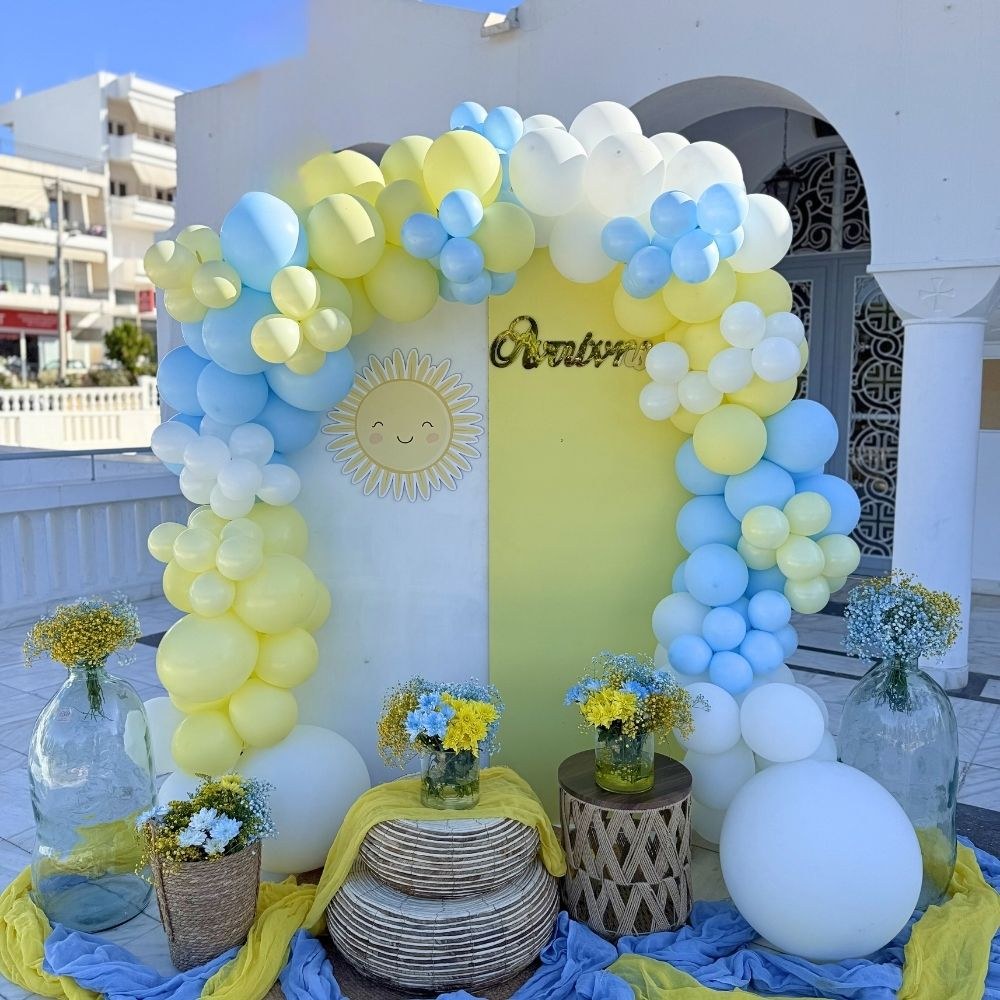 Σήμερα σας παρουσιάζουμε τη βάπτιση του μικρού Αντώνη! Η ομάδα μας επιμελήθηκε το στολισμό βάπτισης, η οποία είχε θέμα τον ήλιο! Στο εξωτερικό της εκκλησίας στήθηκε αψίδα από μπαλόνια σε αποχρώσεις του γαλάζιου και του κίτρινου και πανελ, χαρίζοντας ζωντάνια και #colorful χαρακτήρα στη βάπτιση! Απολαύστε το φωτογραφικό υλικό και κλείστε το ραντεβού σας!