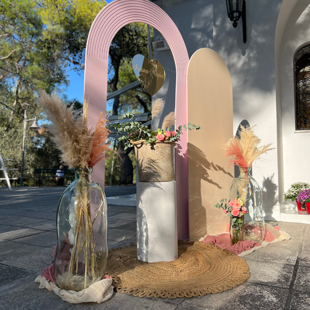 Ακολουθώντας ένα πιο εναλλακτικό ύφος στο στολισμό βάπτισης, γυάλες με pampas grass, αέρινα υφάσματα, φρέσκα λουλούδια κυριάρχησαν στον εξωτερικό χώρο της εκκλησίας! Τα ξύλινα πάνελ σε παστέλ αποχρώσεις, που εμπλουτίστηκαν με το ίδιο μοτίβο στολισμού, απογείωσαν όλο το σκηνικό κι έδωσαν έναν έντονο μποέμ χαρακτήρα στη βάπτιση της μικρής Ιωάννας - Μαρίνας!