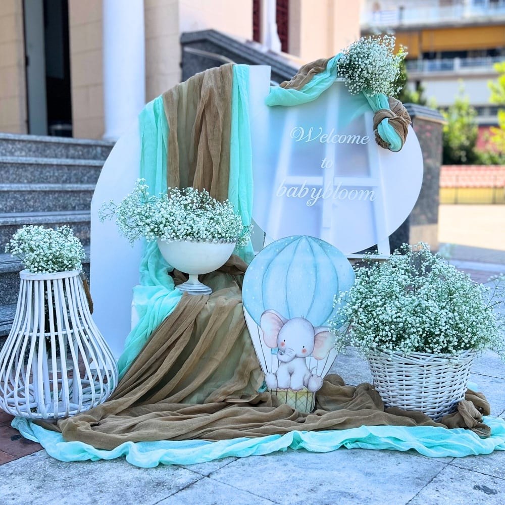 Παιχνιδιάρικος στολισμός βάπτισης για αγόρι με θέμα το αερόστατο και το ελεφαντάκι! Υφάσματα, καλάθια με γυψοφίλη, και ξύλινα πάνελ με ελεφαντάκι και αερόστατο, κόσμησαν τον προαύλιο χώρο της εκκλησίας, χαρίζοντας μία μοναδική βάπτιση!