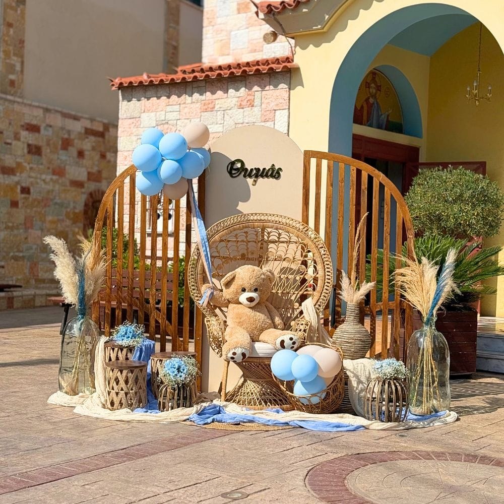 Πανέμορφος στολισμός βάπτισης για αγόρι με θέμα το αρκουδάκι και τα πάνελ, τα αρκουδάκια, τα υφάσματα και τα μπαλόνια να κλέβουν την παράσταση!