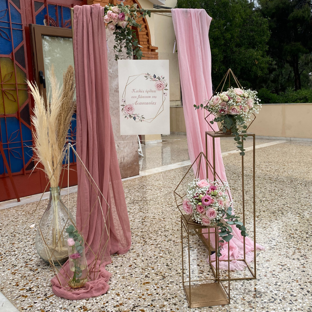 Πολύγωνο, χρυσά γεωμετρικά σχήματα, υφάσματα στις αποχρώσεις του ροζ και του σάπιου μήλου, λουλούδια και pampas grass, συνέθεσαν ένα μοναδικό σκηνικό, που ξεχείλιζε από χαριτωμενιά, ομορφιά και ρομαντισμό! Κλείστε το ραντεβού σας κι ελάτε να δώσουμε στην βάπτιση του παιδιού σας ύφος και προσωπικότητα!