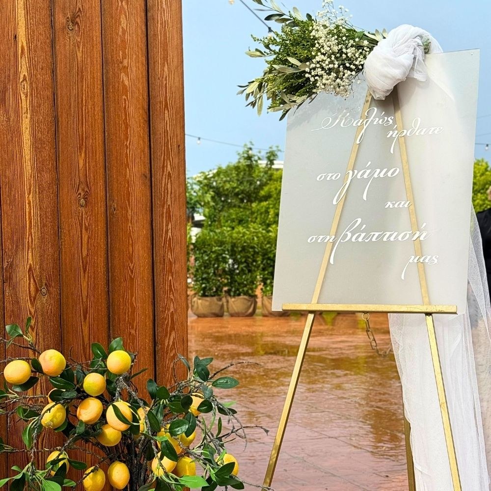Ο στολισμός γάμου και ο στολισμός βάπτισης ήταν εμπνευσμένοι από τα αρώματα και τις υφές του ελληνικού καλοκαιριού: η ελιά, με την αγνή και διαχρονική της ομορφιά, συνδυάστηκε με ζωντανά, κίτρινα λεμόνια που έδωσαν μια δροσερή, παιχνιδιάρικη νότα στο συνολικό setting. Η διακόσμηση της δεξίωσης ξεχώρισε για τη φυσικότητα και την καλαισθησία της – τραπέζια με μποέμ λεπτομέρειες και rustic στοιχεία που ανέδειξαν τη μοναδικότητα του ζευγαριού.