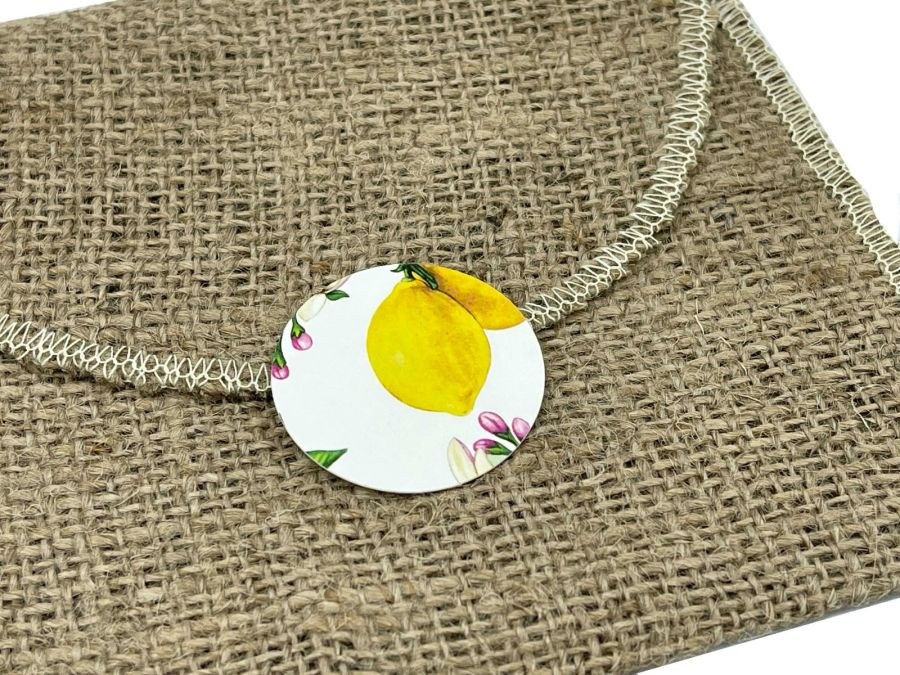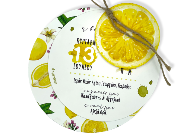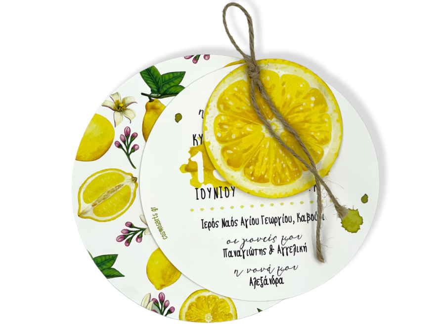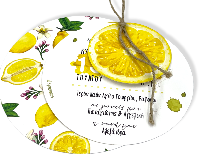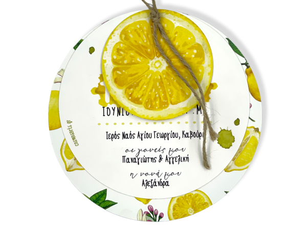 Προσκλητήρια βάπτισης για κορίτσι με θέμα λεμόνι σε λινάτσα