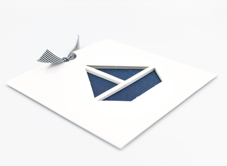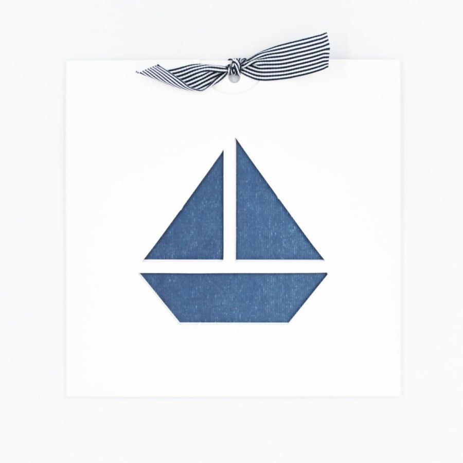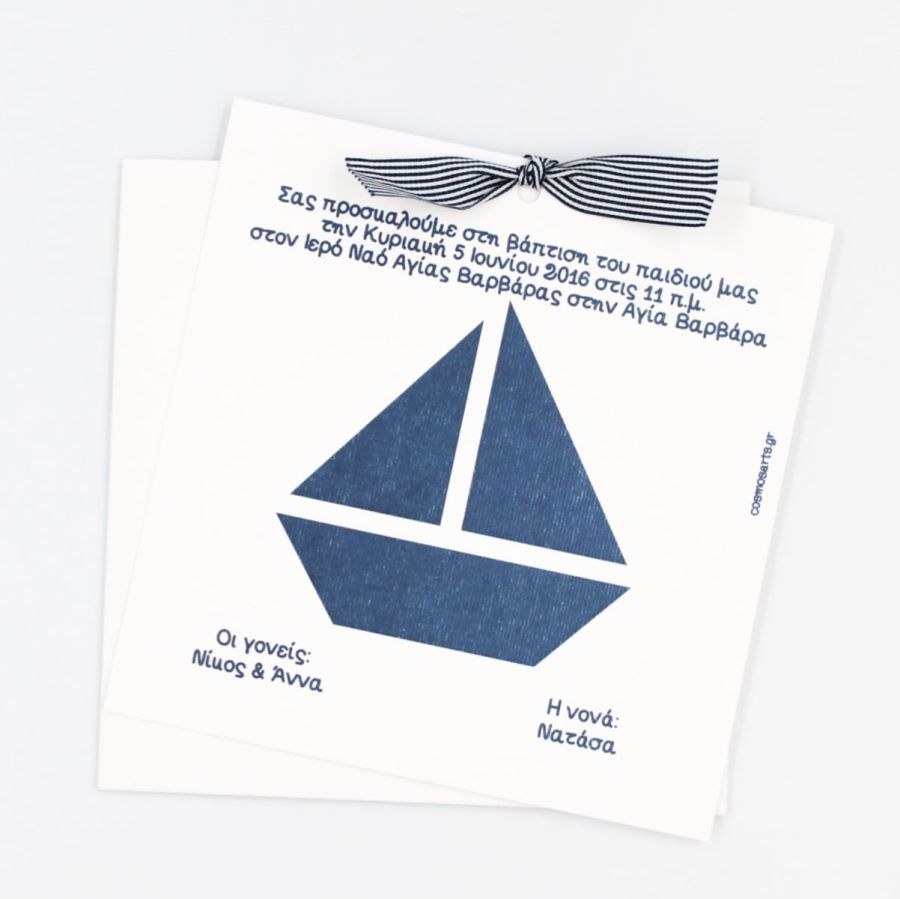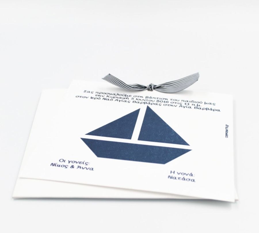 Μοναδικό συρταρωτό προσκλητήριο βάπτισης με κοπτικό καραβάκι, λευκό φάκελο και μπλε ναυτική κορδέλα ριγέ.