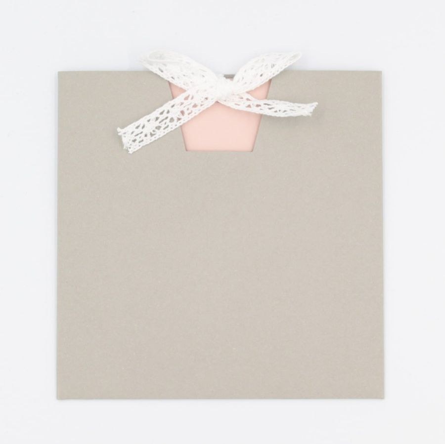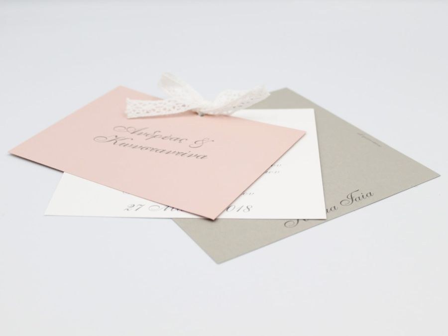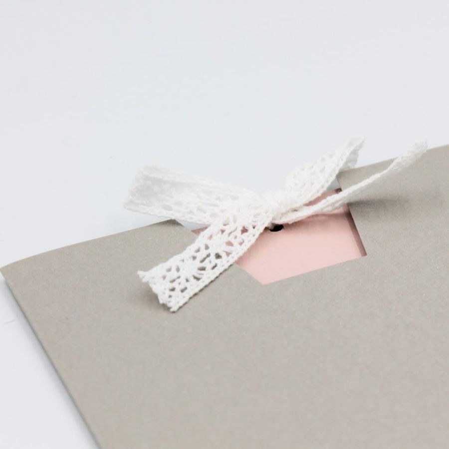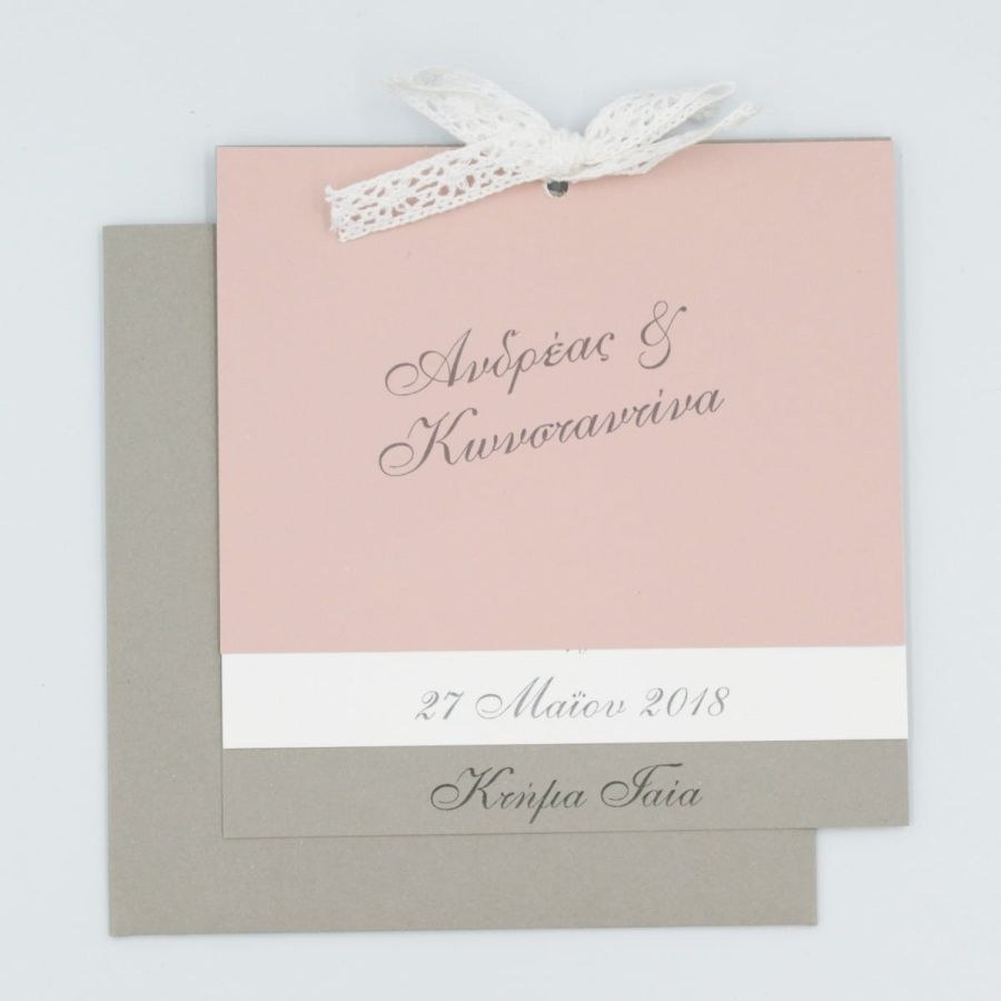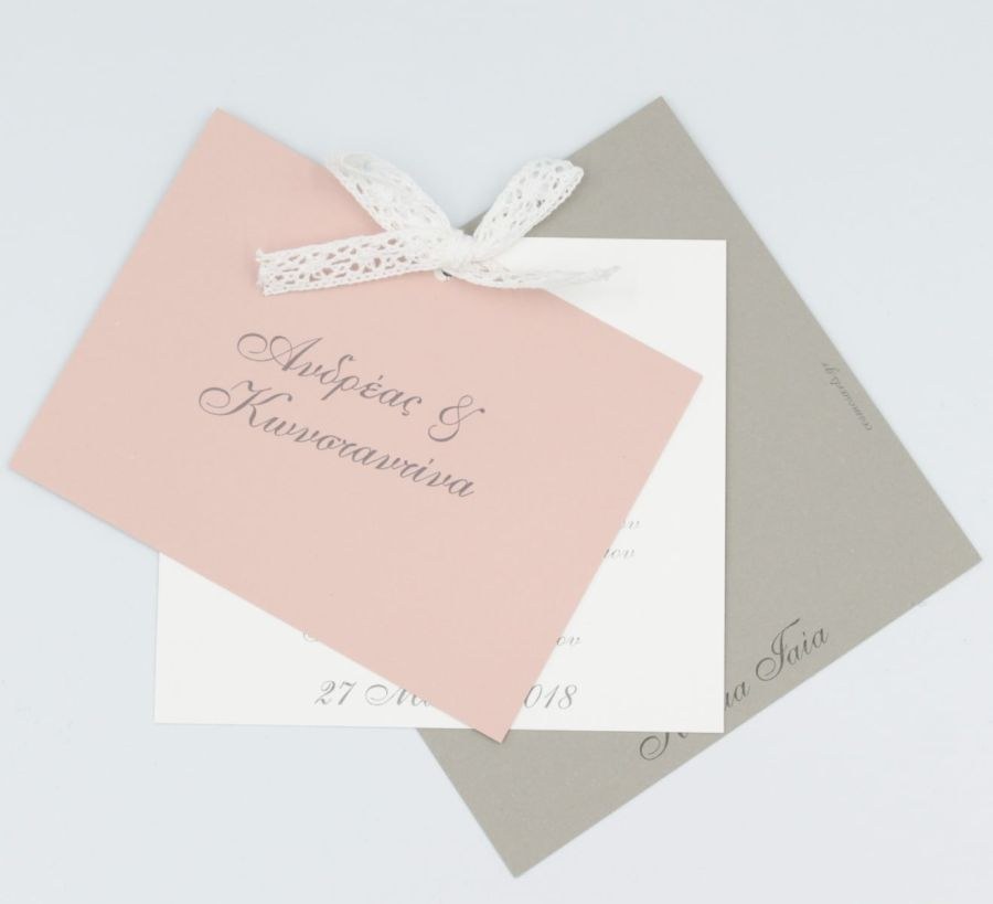 Πρωτότυπο προσκλητήριο γάμου με τριπλή κάρτα σε γκρι και σάπιο μήλο αποχρώσεις, δέσιμο από βαμβακερή δαντέλα!