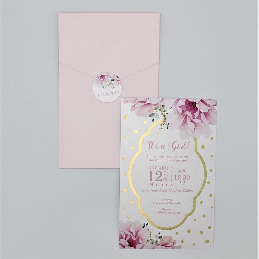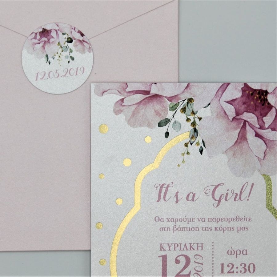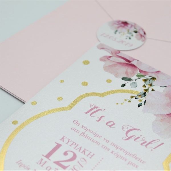 Εντυπωσιακό προσκλητήριο βάπτισης για κορίτσι, φλοράλ θέμα και glitter χρυσοτυπία. tip: Φτιάχτε στο ίδιο θέμα το βιβλίο ευχών της βάπτισης του παιδιού σας, την μπομπονιέρα, το σουβέρ και το σουπλά.