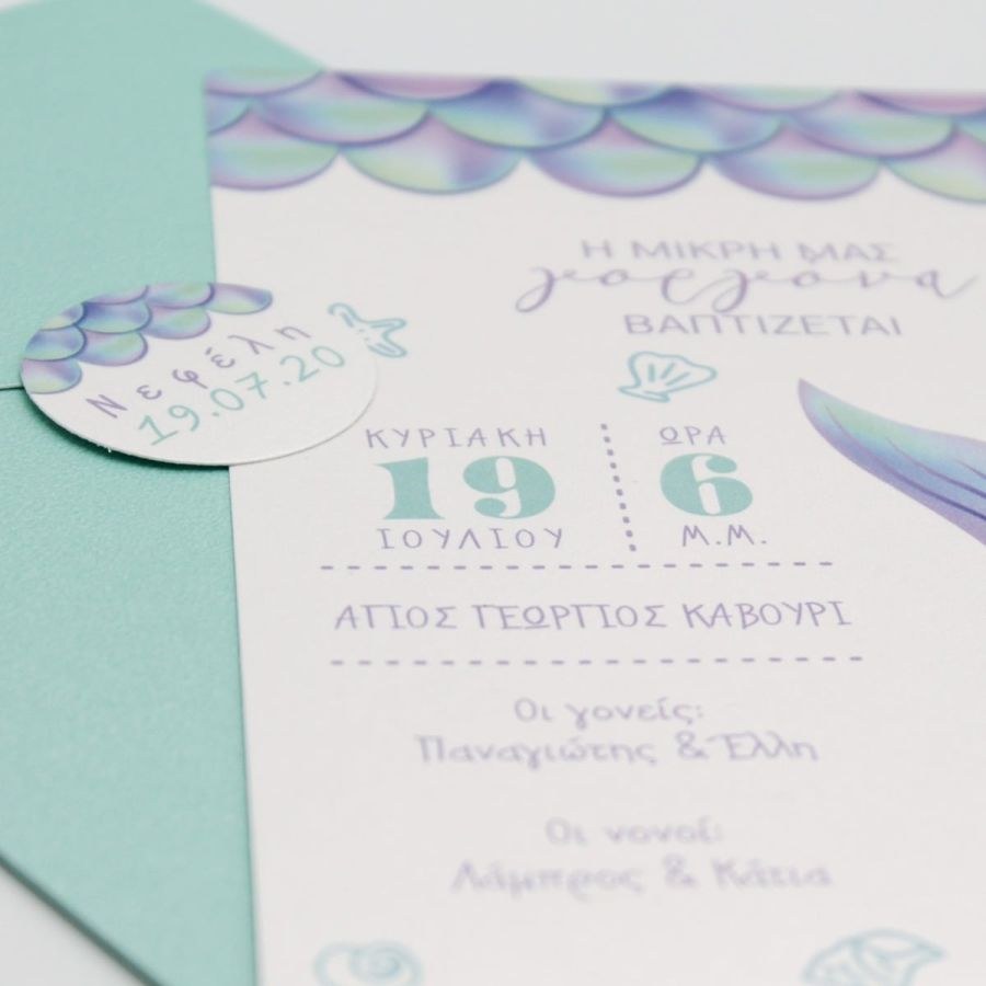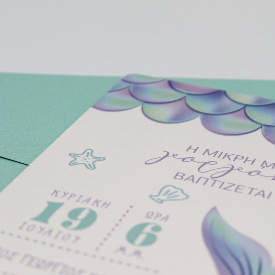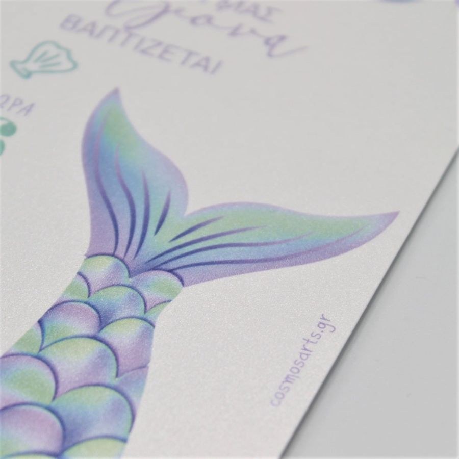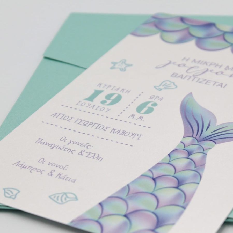 Προσκλητήριο βάπτισης με θέμα τη γοργόνα, από μεταλιζέ χαρτιά και φάκελο Shiny Acqua.