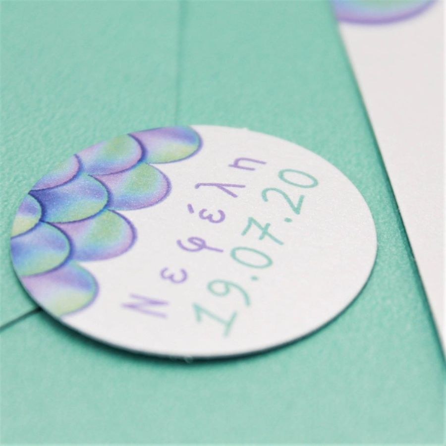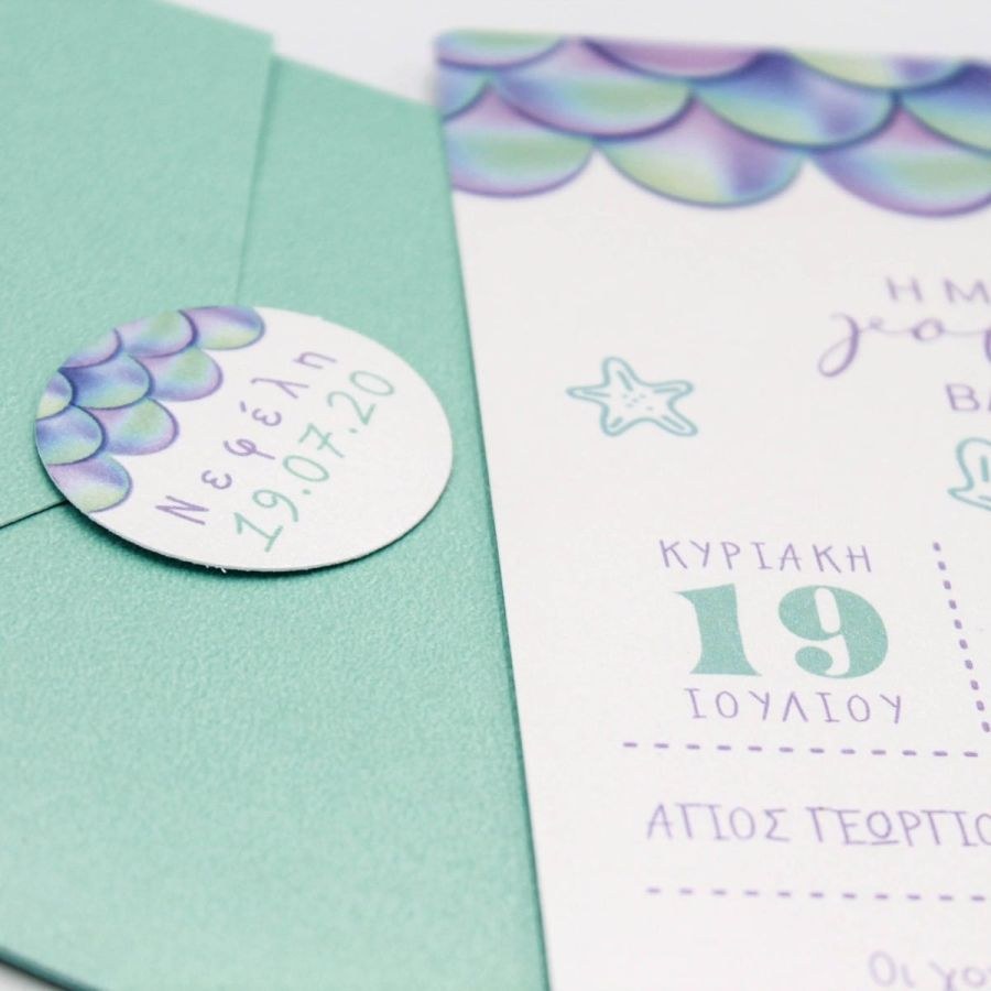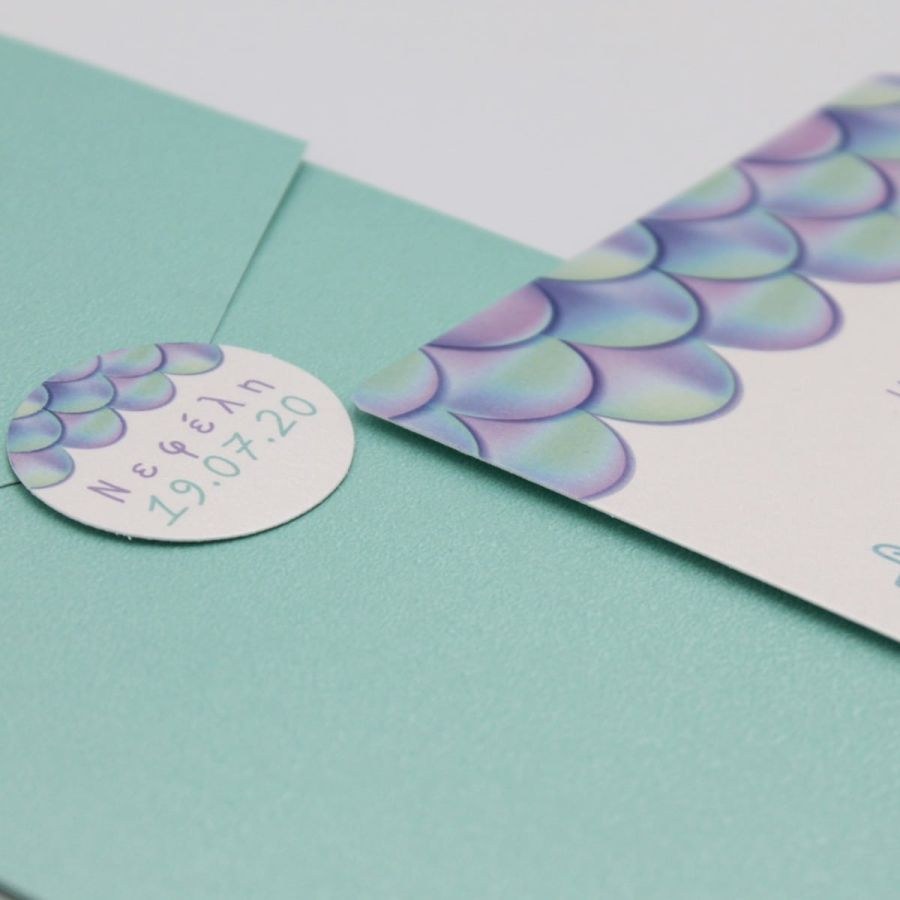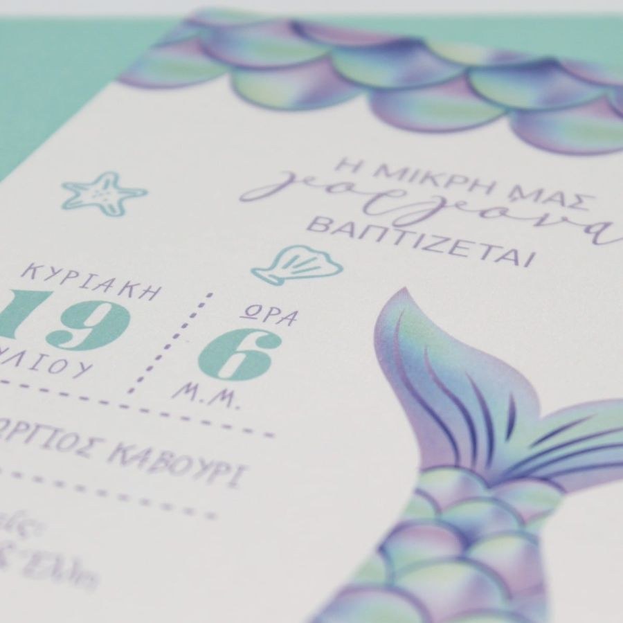 Προσκλητήριο βάπτισης με θέμα τη γοργόνα, από μεταλιζέ χαρτιά και φάκελο Shiny Acqua.