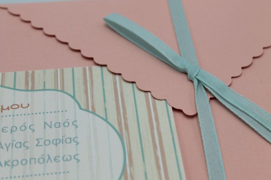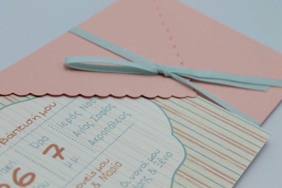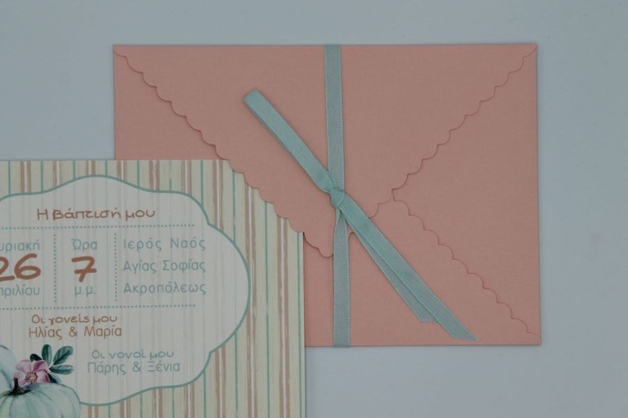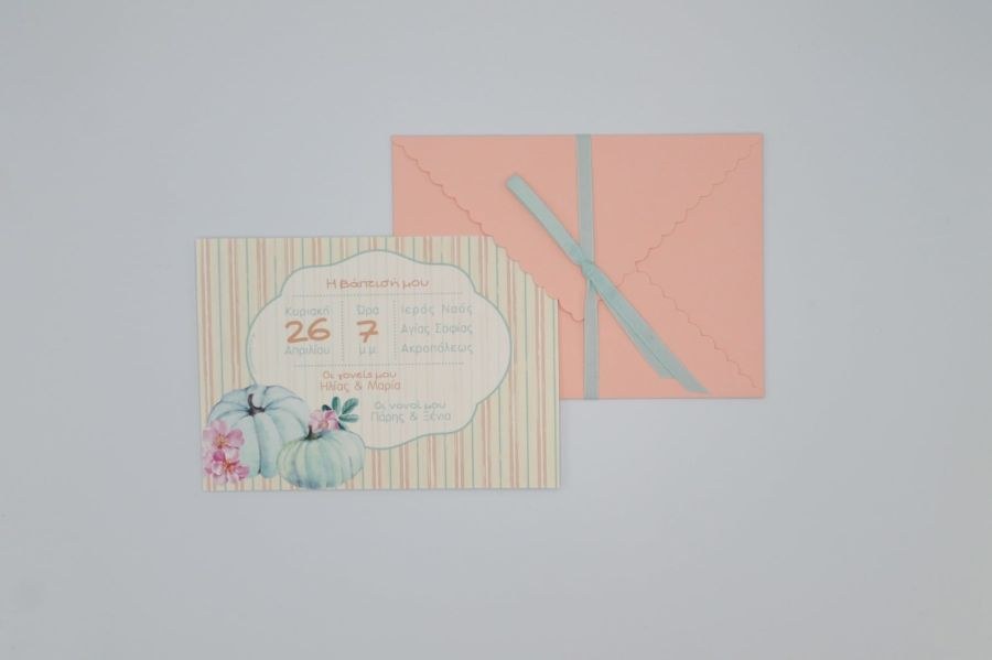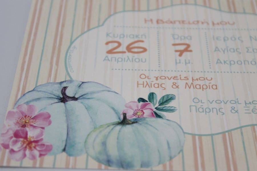 Προσκλητήριο βάπτισης με θέμ την κολοκύθα σε σομόν και βεραμάν αποχρώσεις.
