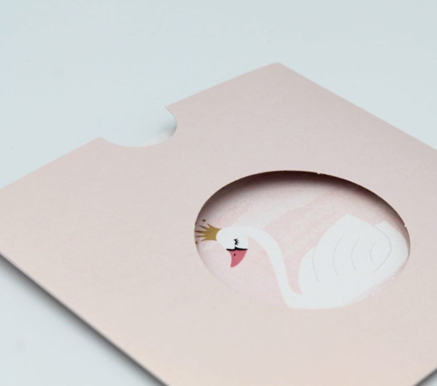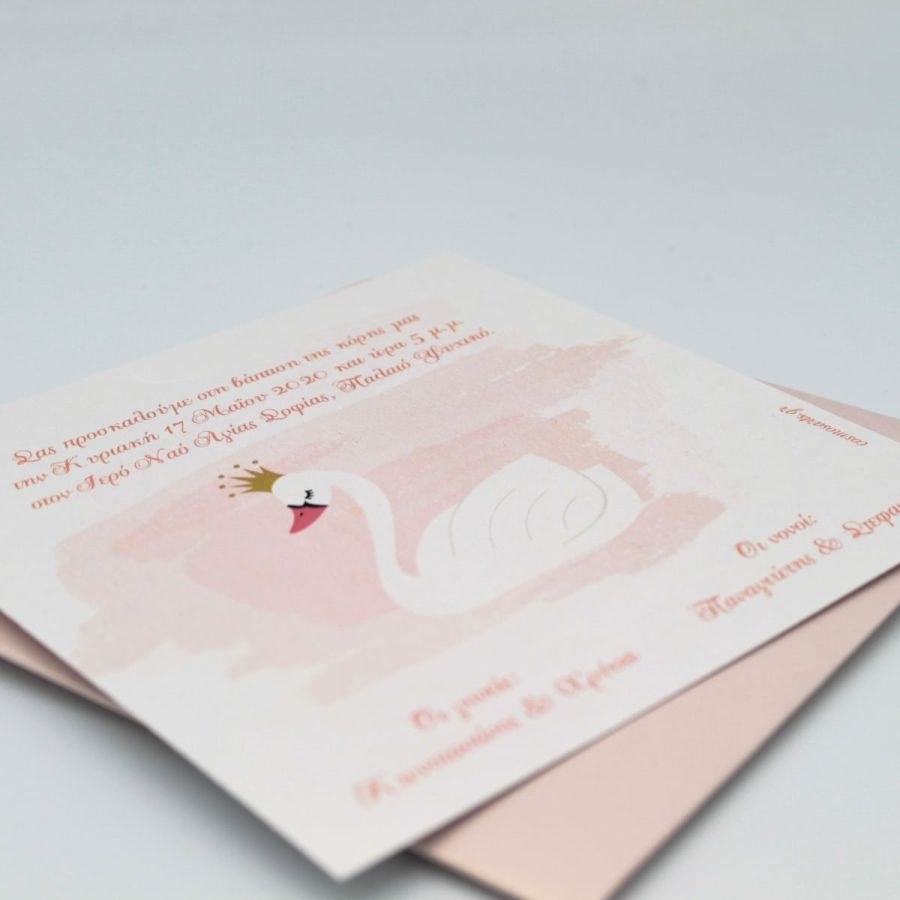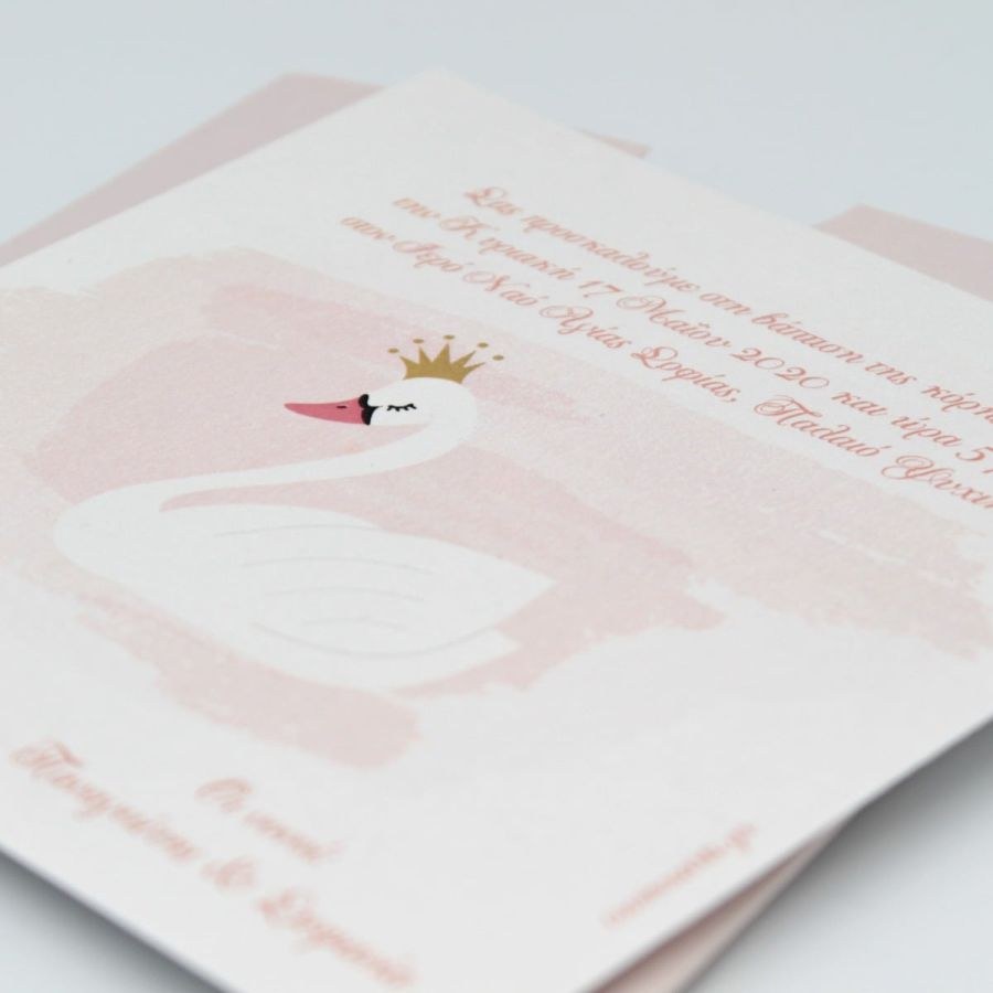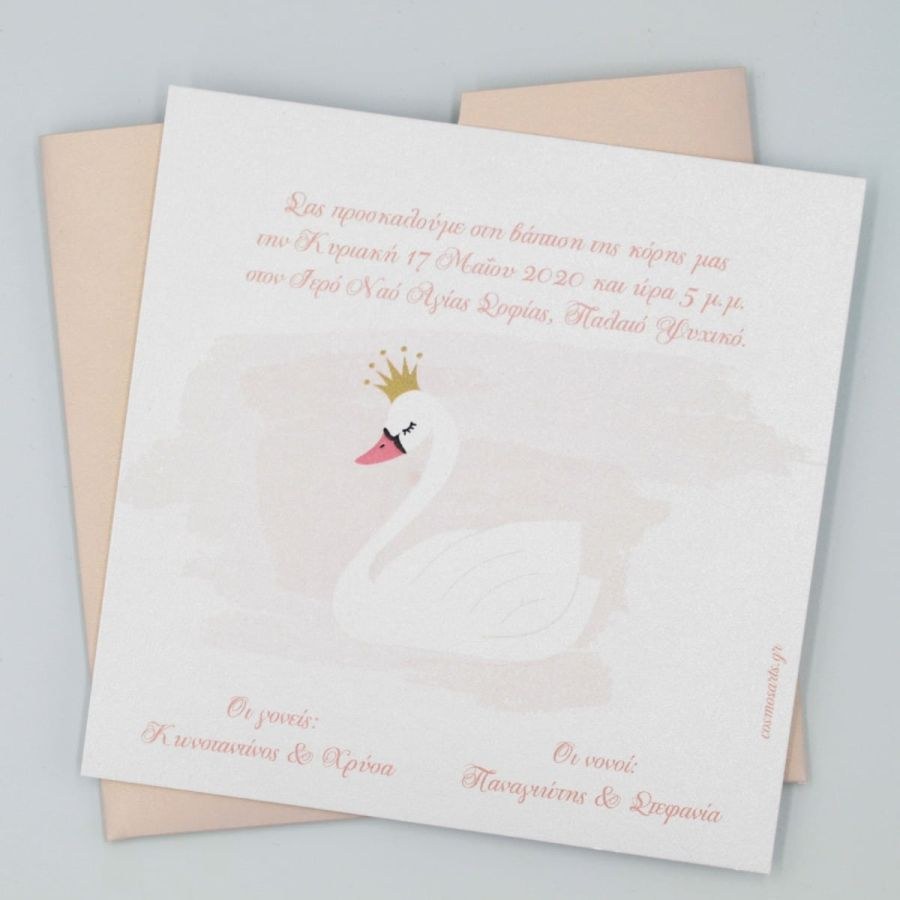 Συρταρωτό μεταλιζέ προσκλητήριο βάπτισης με θέμα τον κύκνο.