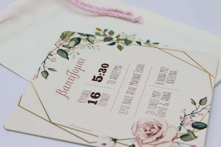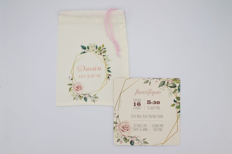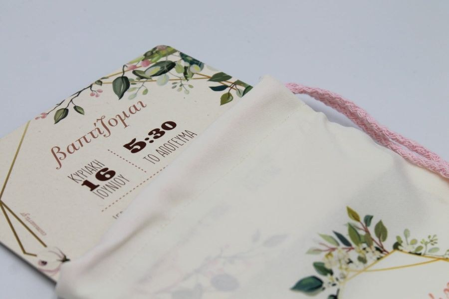 Μοναδικό προσκλητήριο βάπτισης για κορίτσι, εκτυπωμένος φάκελος πουγκί και καρτολίνα. tip: Φτιάχτε στο ίδιο θέμα το βιβλίο ευχών της βάπτισης του παιδιού σας, την μπομπονιέρα, το σουβέρ και το σουπλά. Συνδυάστε επίσης το σετ νονού στο ίδιο θέμα