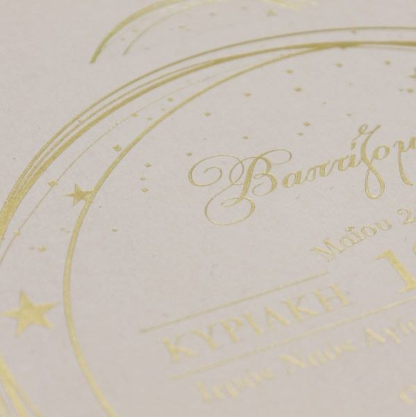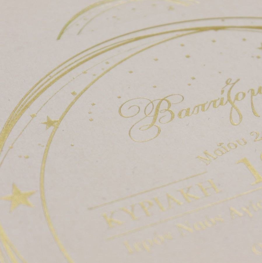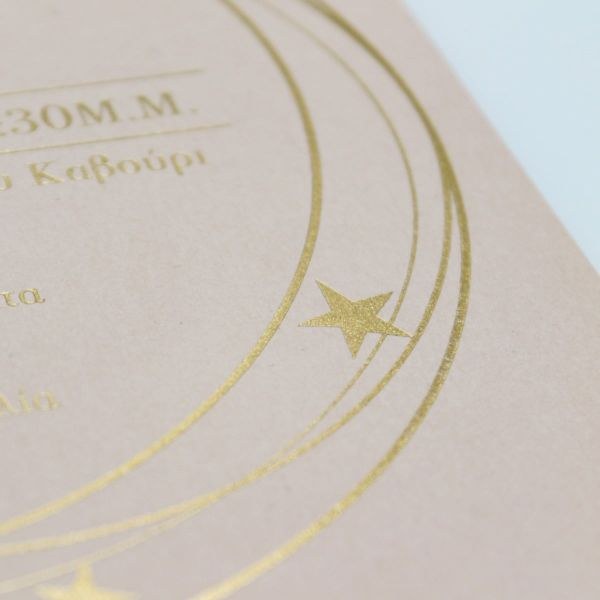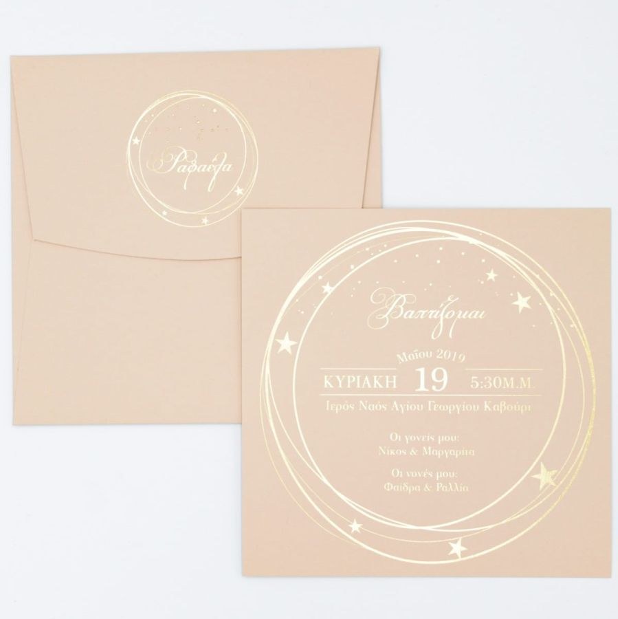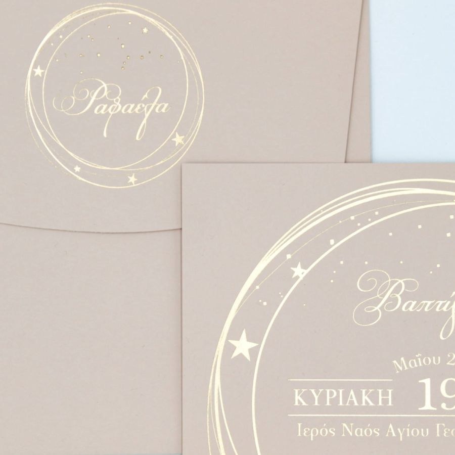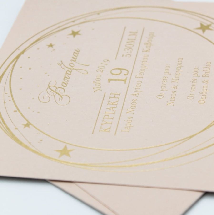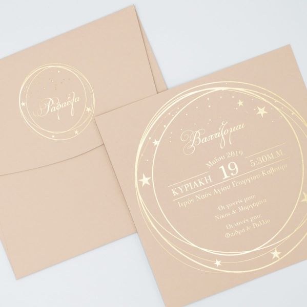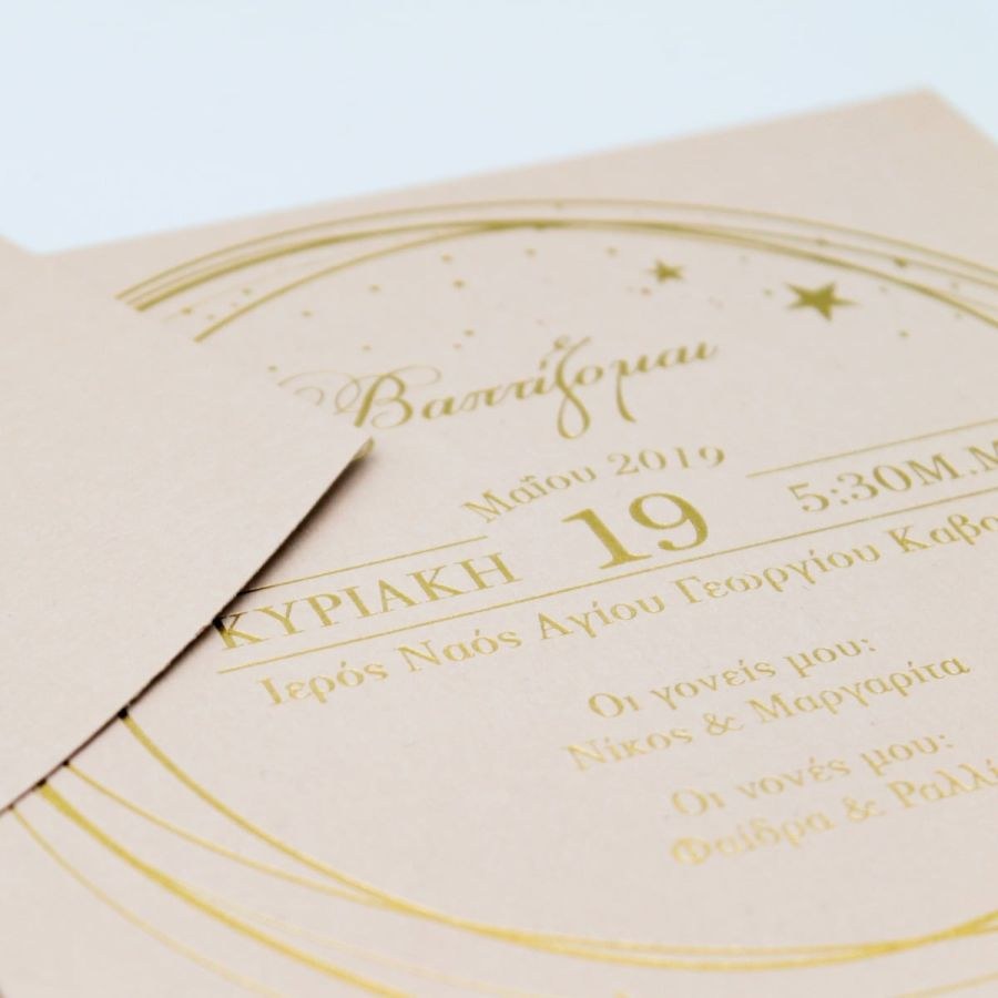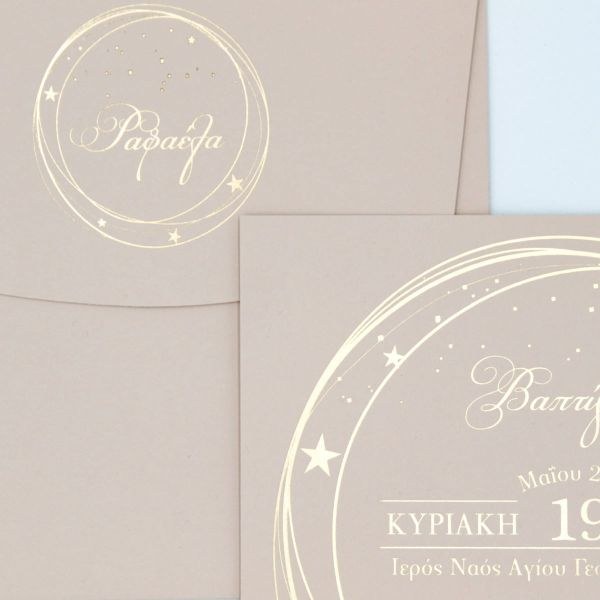 Μοναδικό προσκλητήριο βάπτισης, χαρτί nude με βελούδινη υφή και εντυπωσιακή μακέτα χρυσοτυπίας.
