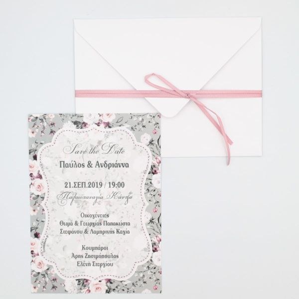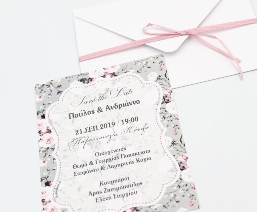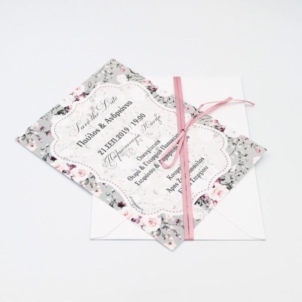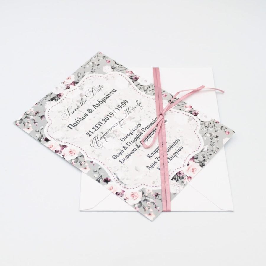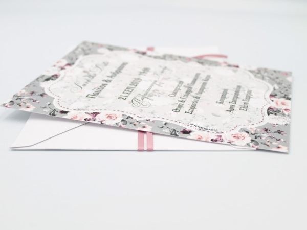 Προσκλητήρια γάμου με φλοράλ φόδρα σε ιδιαίτερο φάκελο με υφή υφάσματος. tip: Φτιάχτε στο ίδιο θέμα το δικό σας βιβλίο ευχών, την μπομπονιέρα, το σουβέρ και το σουπλά