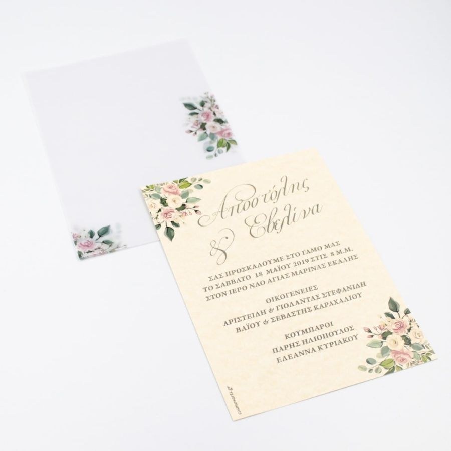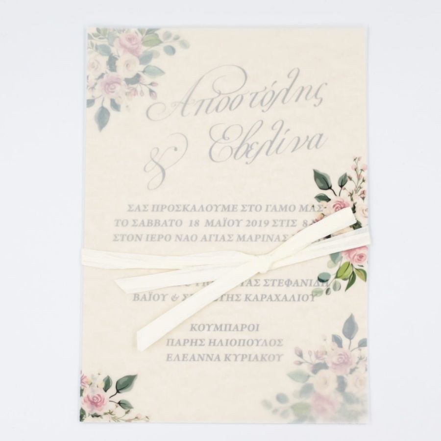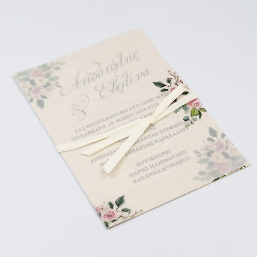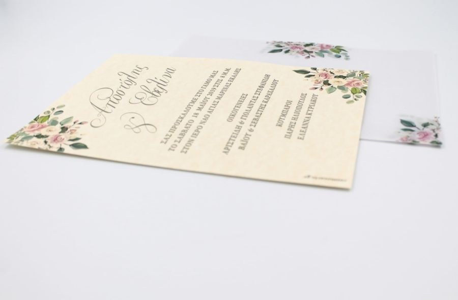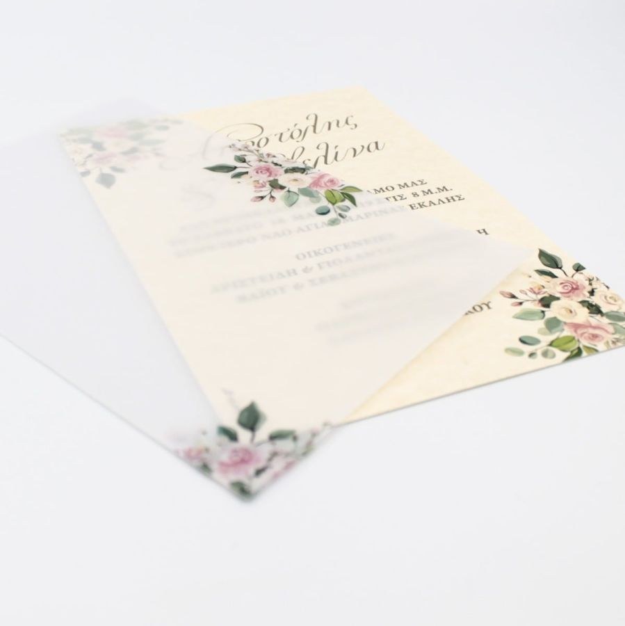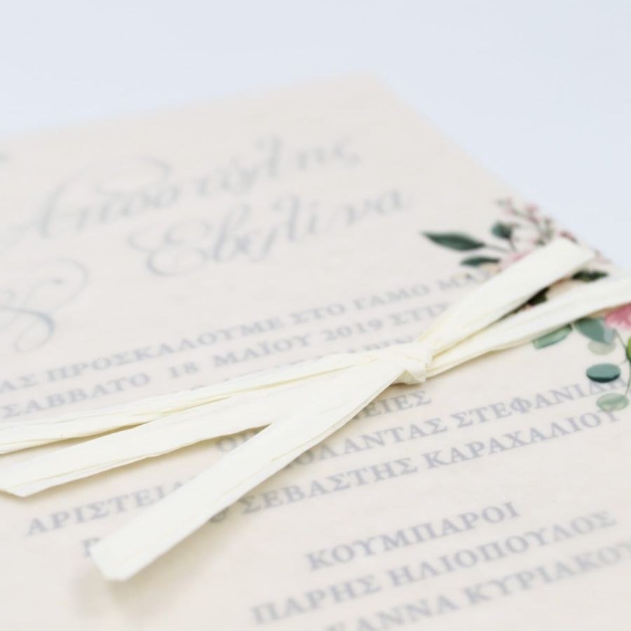 Δίπτυχα προσκλητήρια γάμου σε φλοράλ ριζόχαρτο. tip: Φτιάχτε στο ίδιο θέμα το δικό σας βιβλίο ευχών, την μπομπονιέρα, το σουβέρ και το σουπλά