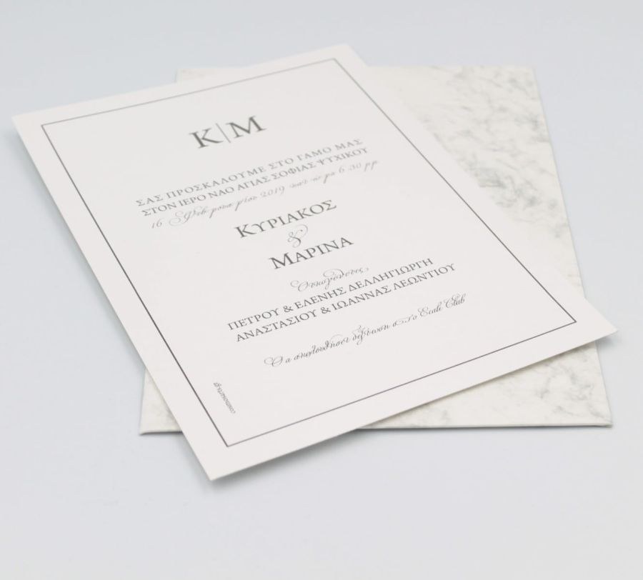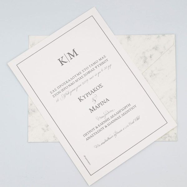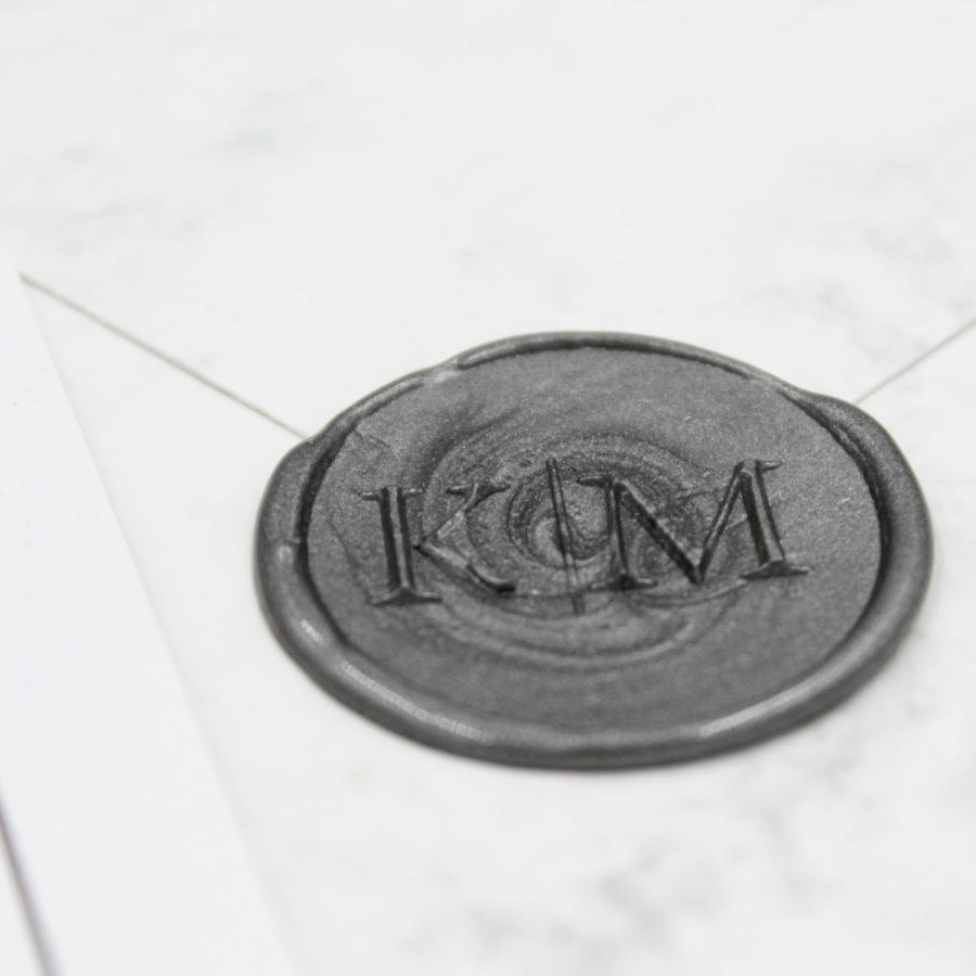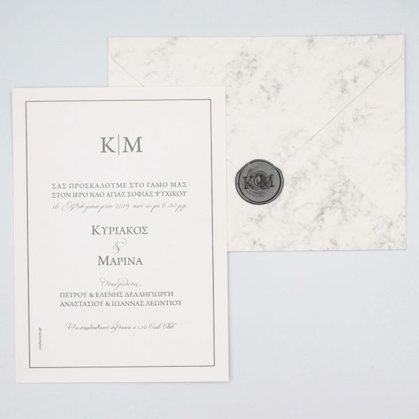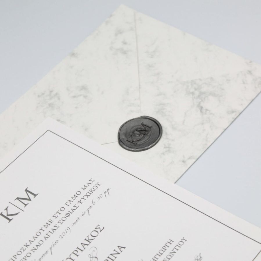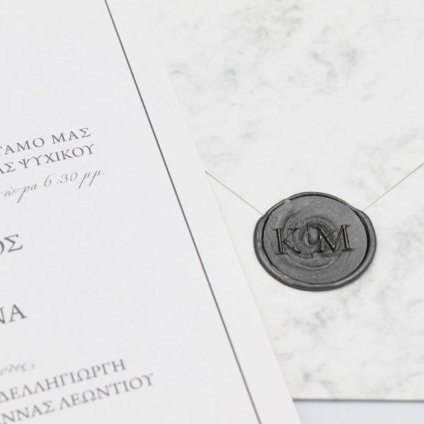 Μοντέρνα προσκλητήρια γάμου με φάκελο μάρμαρο, γκρι βουλοκέρι. tip: βουλοκέρι στο χρώμα της αρεσκείας σας με μονογράμματα ή ημερομηνία ή άλλο σχέδιο