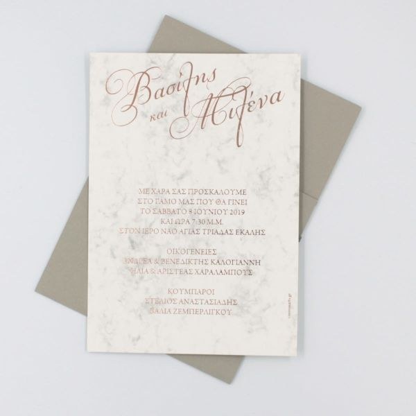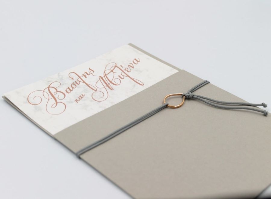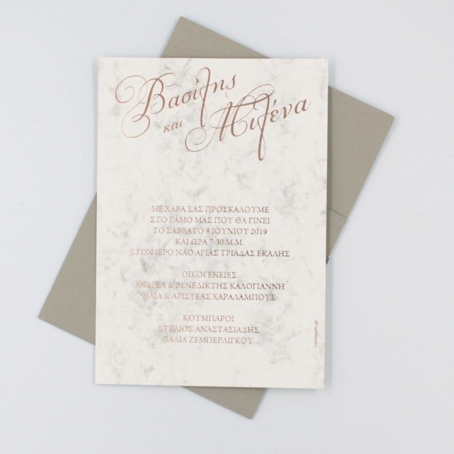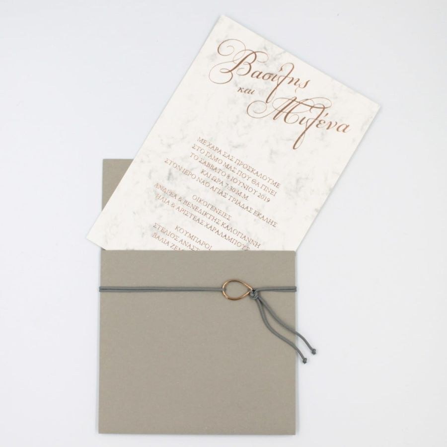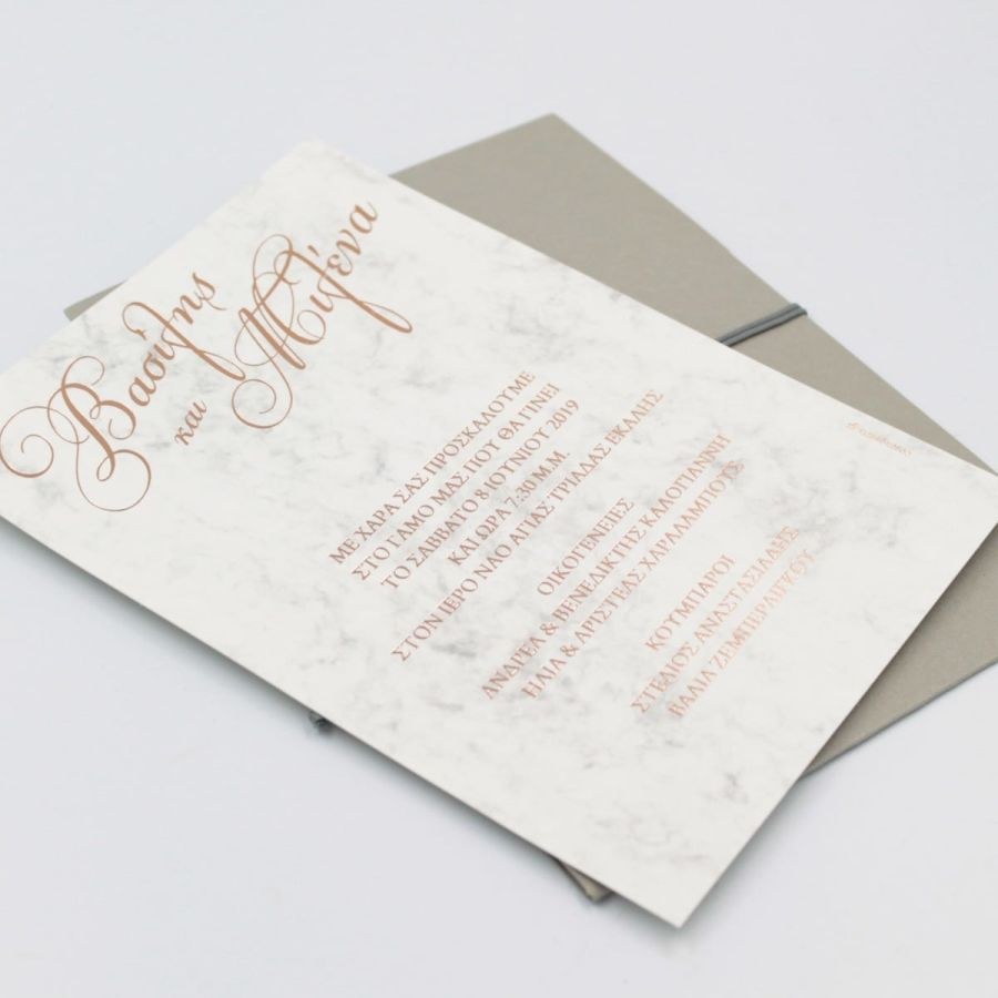 Μοντέρνα προσκλητήρια γάμου με φόντο το μάρμαρο, θερμοτυπία ροζ-χρυσό και με ιδιαίτερο δέσιμο.