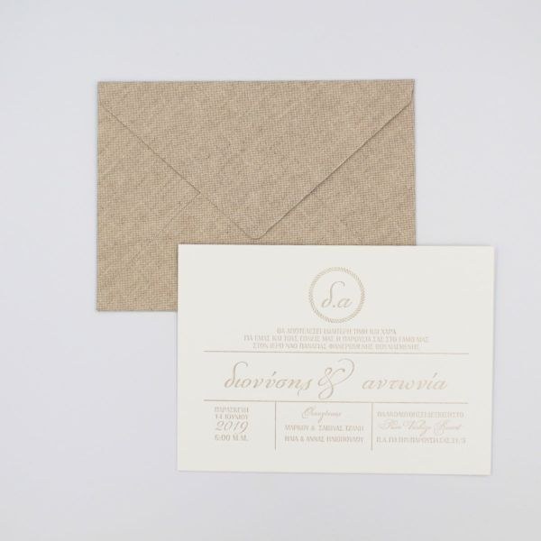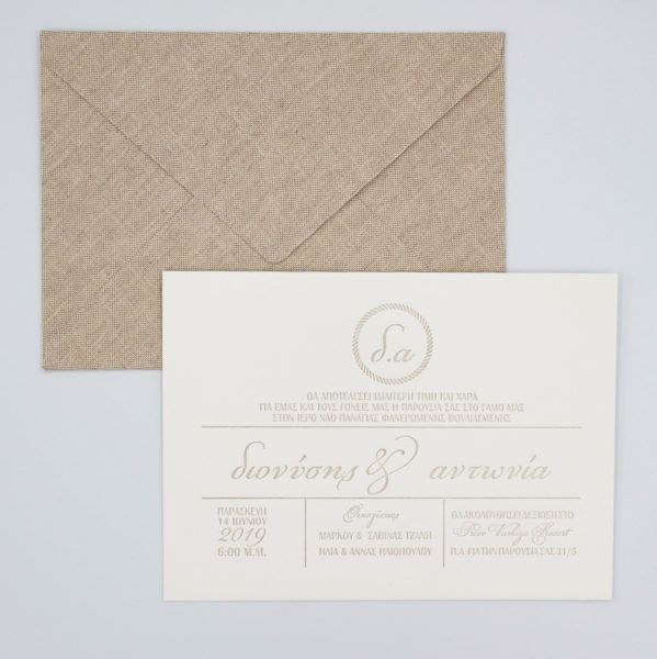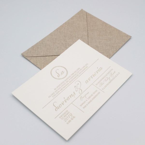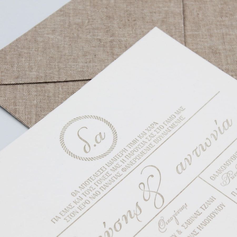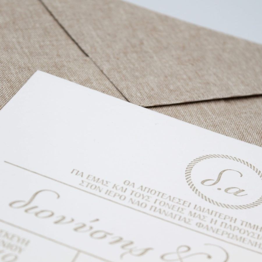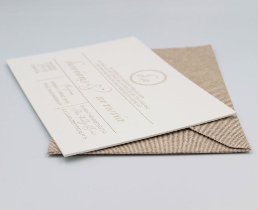 Εντυπωσιακά προσκλητήρια γάμου με υφασμάτινο φάκελο, καρτολίνα 850γρ με βαμβακερή υφή και βαθυτυπίες.