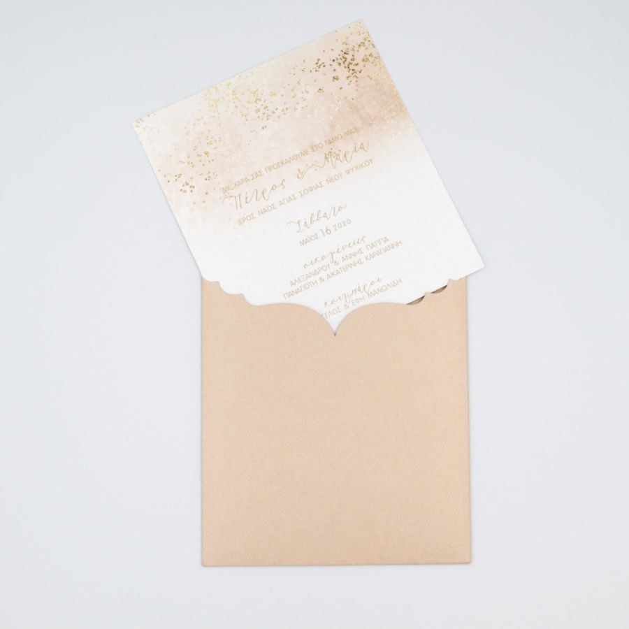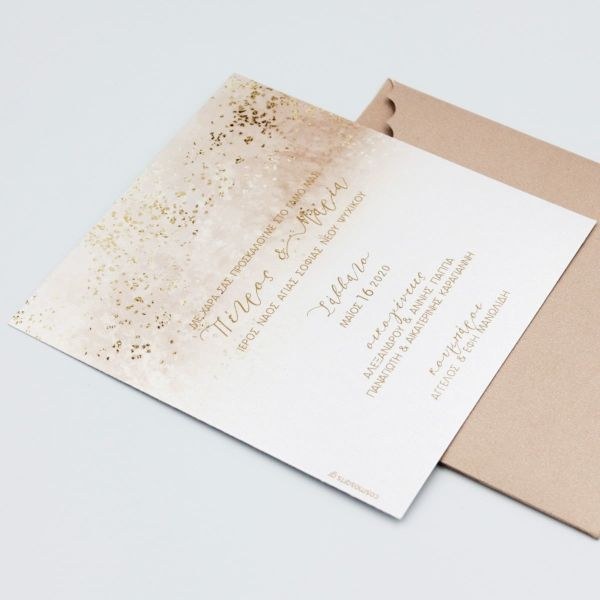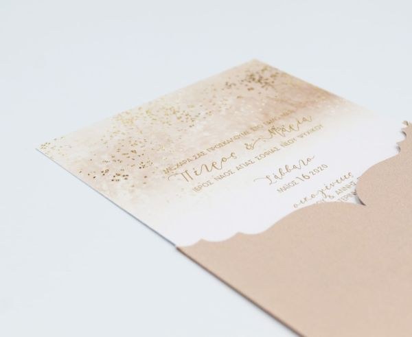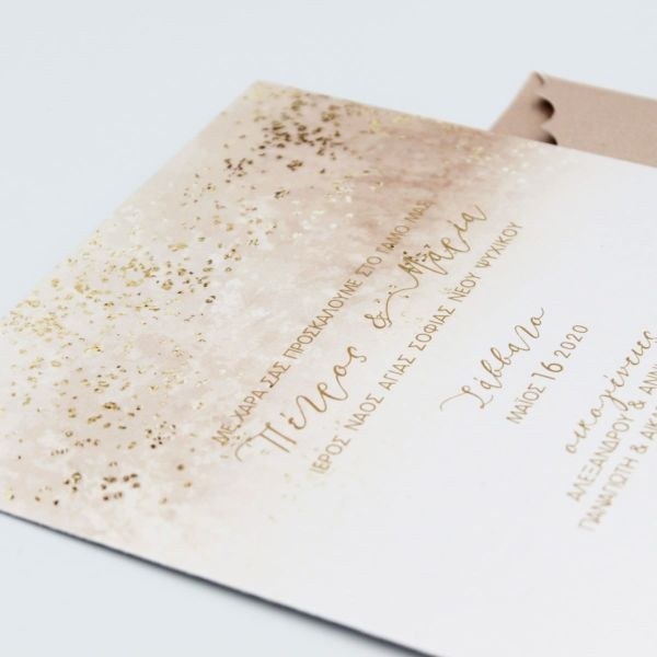 Ιδιαίτερα προσκλητήρια γάμου, nude αποχρώσεις και χρυσές πινελιές.