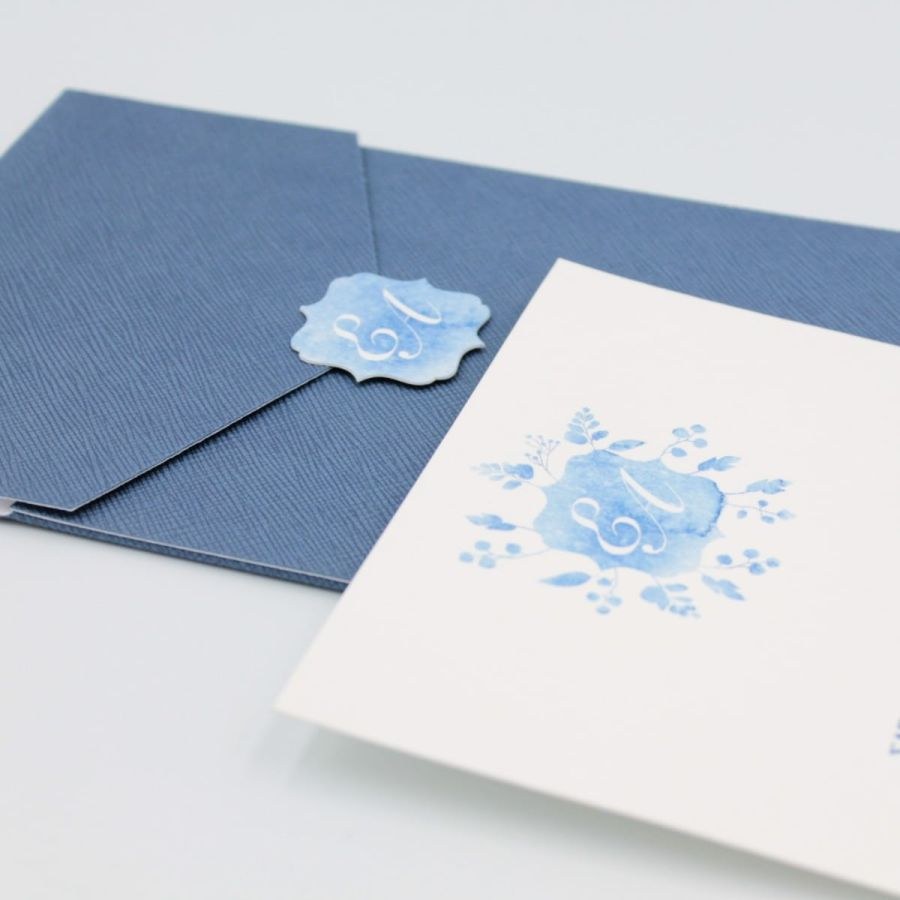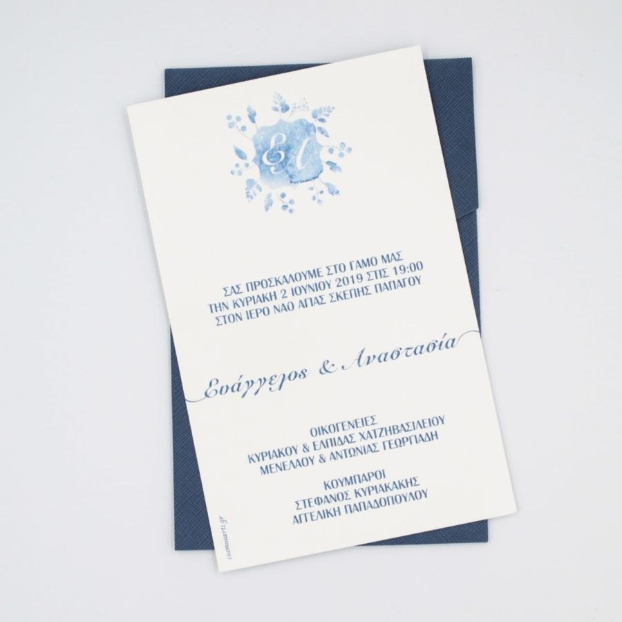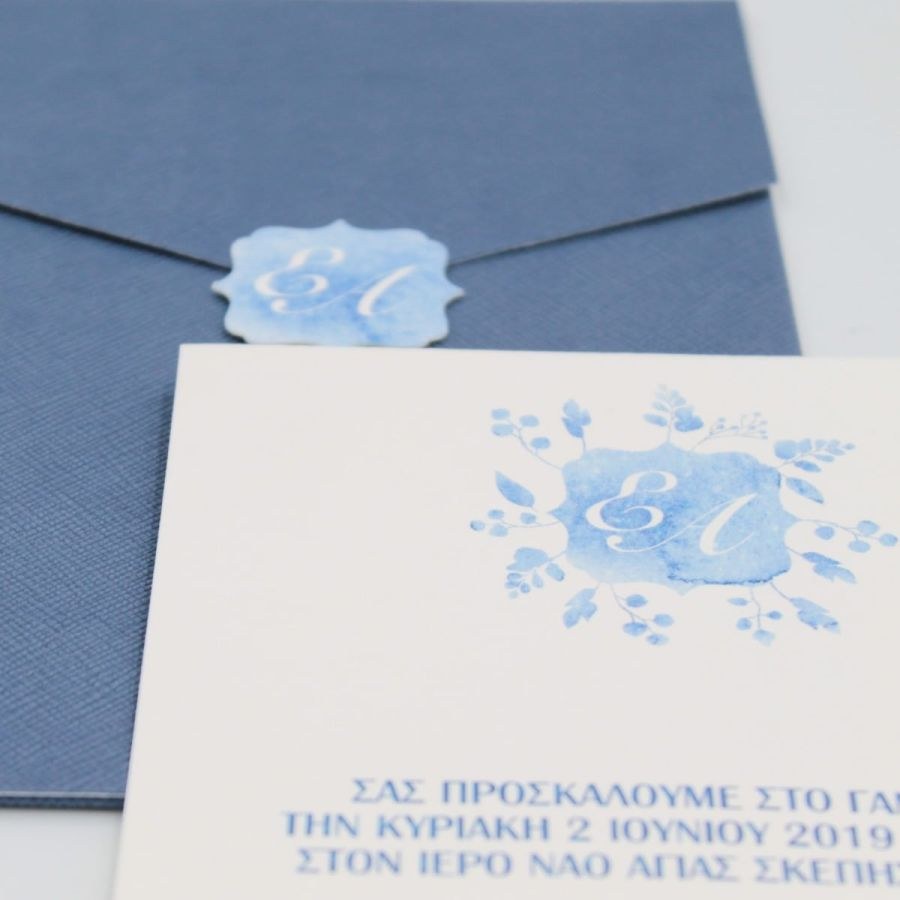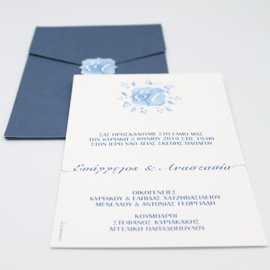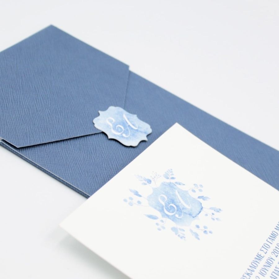 Μοναδικά προσκλητήρια γάμου, μπλέ φάκελος δερματίνης και κάρτα με βαμβακερή υφή.