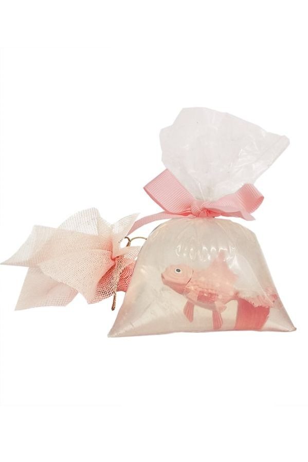 Μπομπονιέρα ροζ ψαράκι μέσα σε σαπούνι, αυτό που μοιάζει με νερό είναι σαπούνι, που όταν λιώσει σας μένει το ψαράκι…16x11cm 170gr.