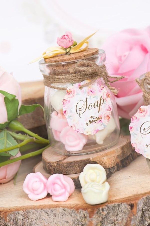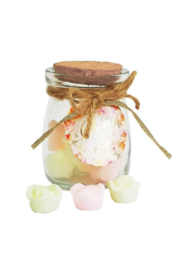 Μπομπονιέρα βαζάκι με σαπούνια ροζ λουλούδια. Διάσταση 7 x 5,5 εκ.  60 gr.