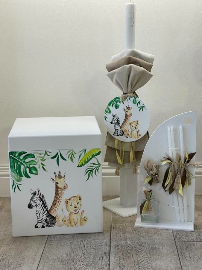 Σετ βάπτισης που περιλαμβάνει κύβο ζωγραφισμένο με θέμα τα ζωάκια του δάσους, λαμπάδα και λαδοσετ.