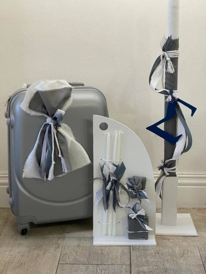 Σετ βάπτισης που περιλαμβάνει βαλίτσα στολισμένη, λαμπάδα και λαδοσετ.