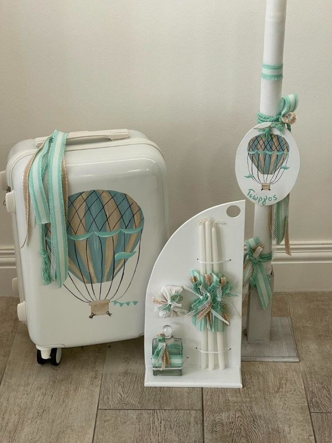 Σετ βάπτισης που περιλαμβάνει βαλίτσα ζωγραφισμένη με θέμα το αερόστατο, λαμπάδα και λαδοσετ.