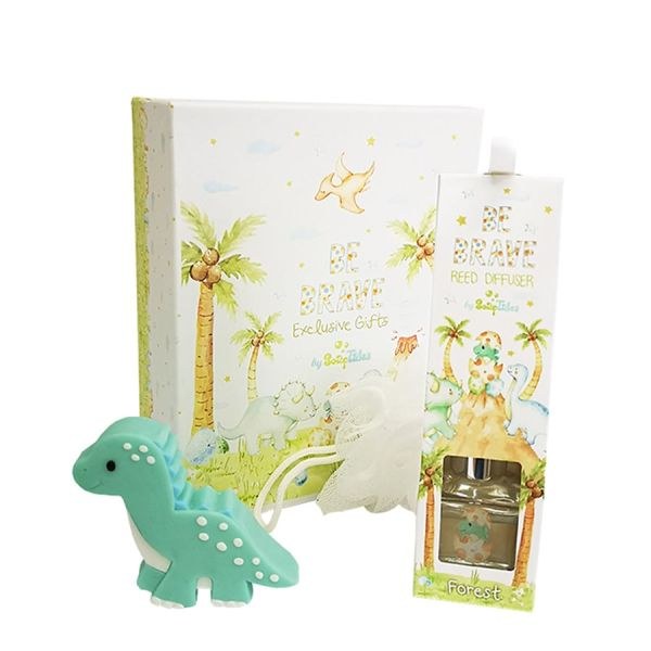 Κουτί Δεινόσαυρος 21 x 17 x 7 (μήκος, πλάτος, ύψος), Αρωματικό Forest 50ml, Σαπούνι Δεινόσαυρος 100gr, Σφουγγαράκι, Χαρτί αφής κραφτ.