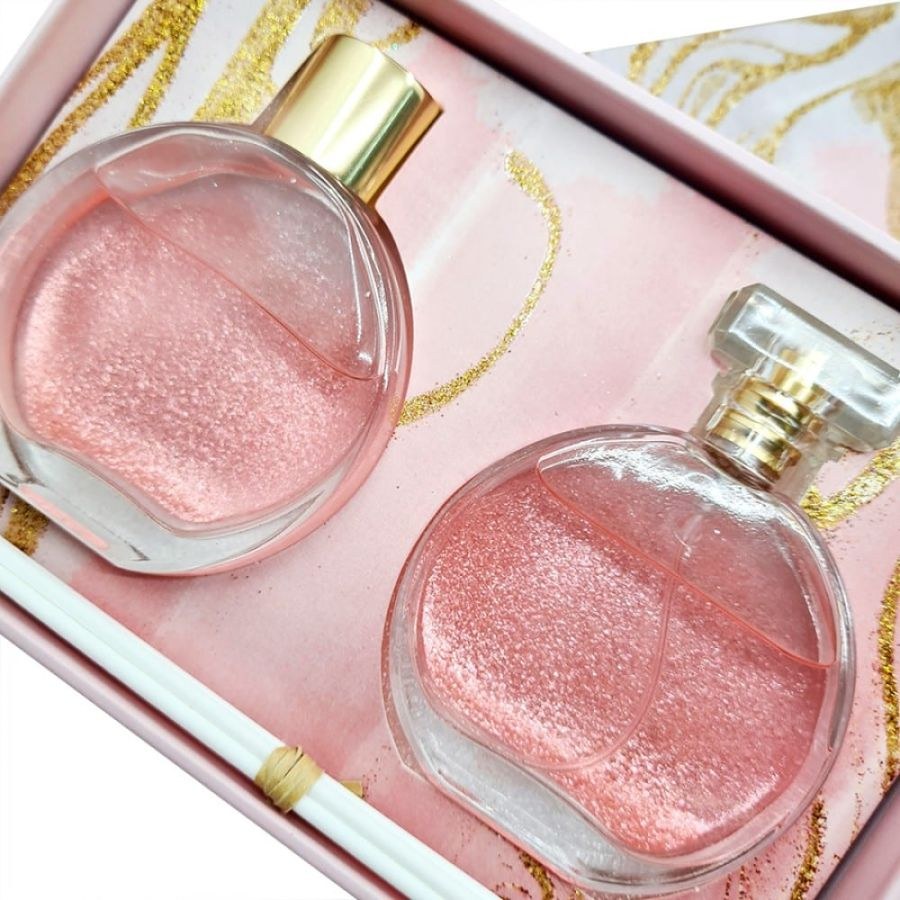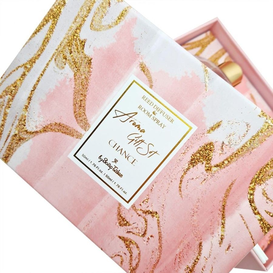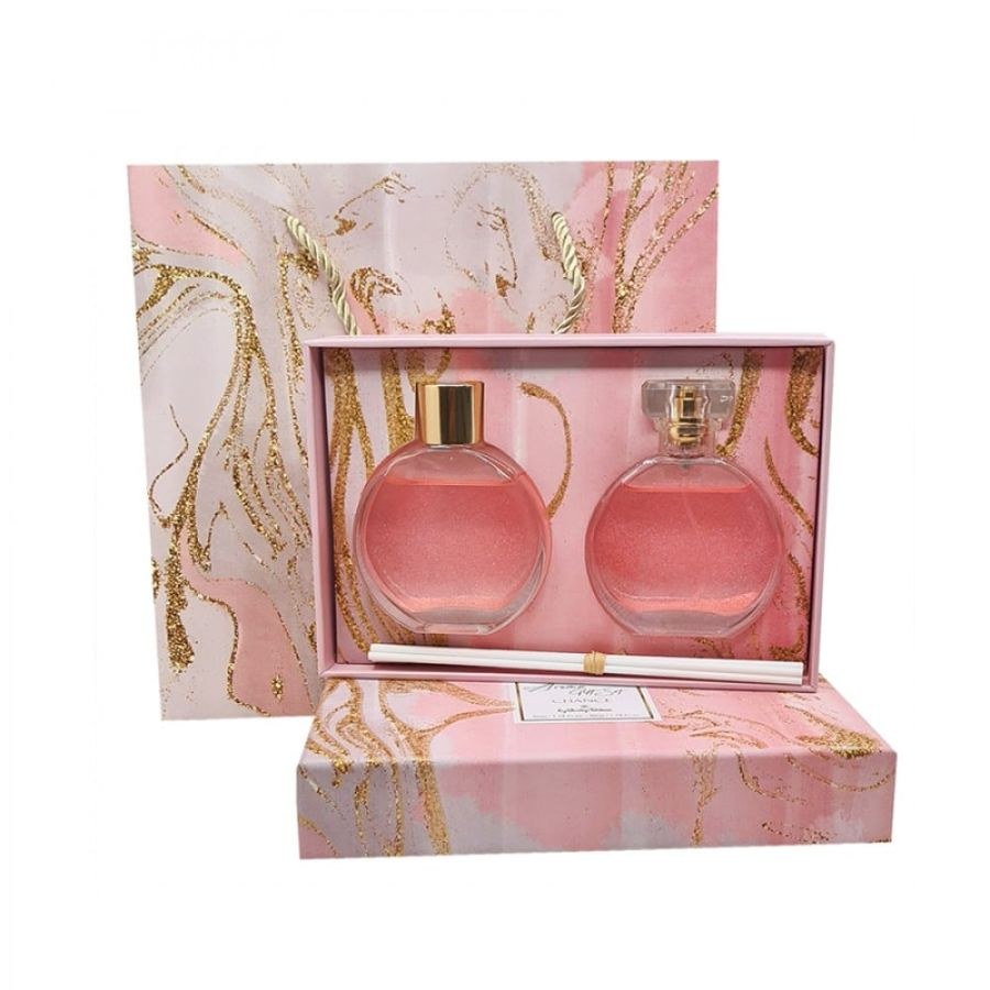Σετ δώρου με αρωματικό χώρου 60ml και room spray 60ml σε πολυτελή συσκευασία και ίδια τσάντα δώρου μαζί.