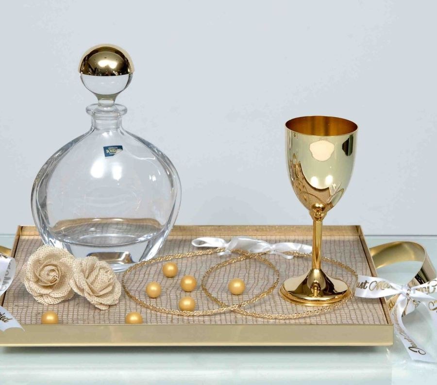 Σετ γάμου που περιλαμβάνει δίσκο με υφή ψάθας, καράφα κρυστάλλινη, πώμα καράφας, ποτήρι κρασιού μεταλλικό και στέφανα γάμου.