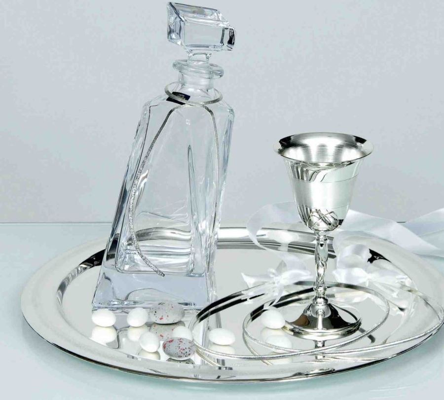 Το σετ γάμου περιλαμβάνει δίσκος, καράφα, ποτήρι, στέφανα.
