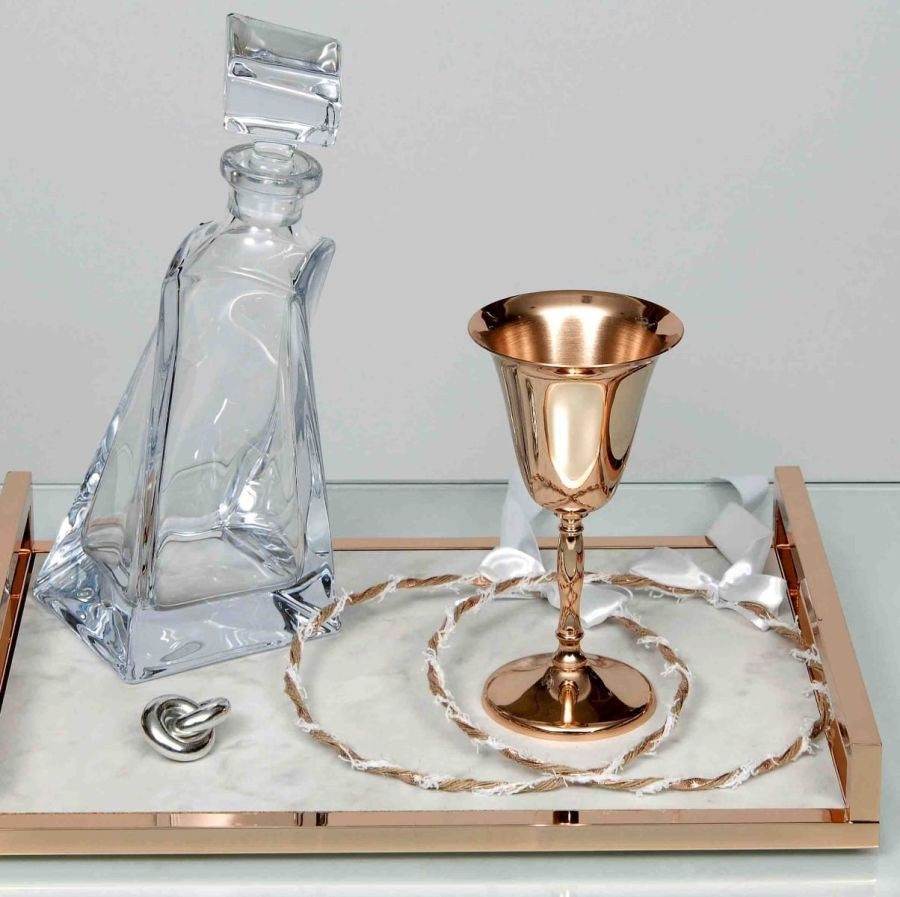 Σετ γάμου που περιλαμβάνει δίσκο με υφή μαρμάρου, καράφα κρυστάλλινη, ποτήρι κρασιού μεταλλικό, στέφανα γάμου.