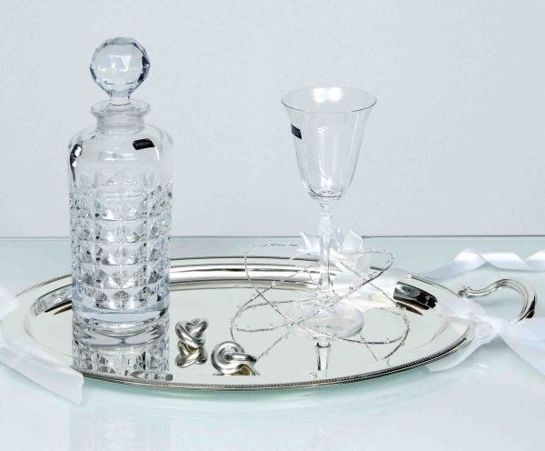 Το σετ γάμου περιλαμβάνει δίσκο, καράφα κρυστάλλινη, ποτήρι κρυστάλλινο και στέφανα γάμου.