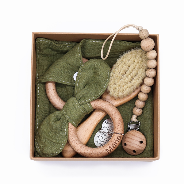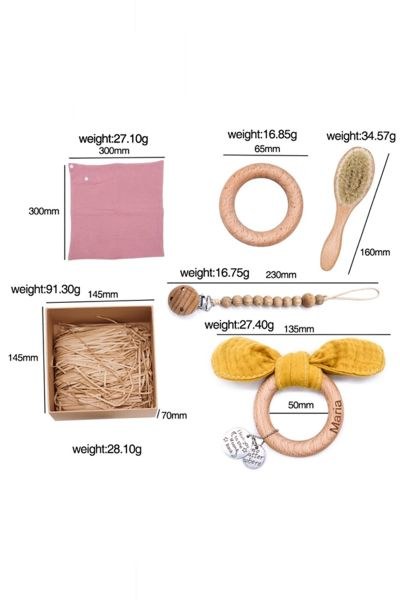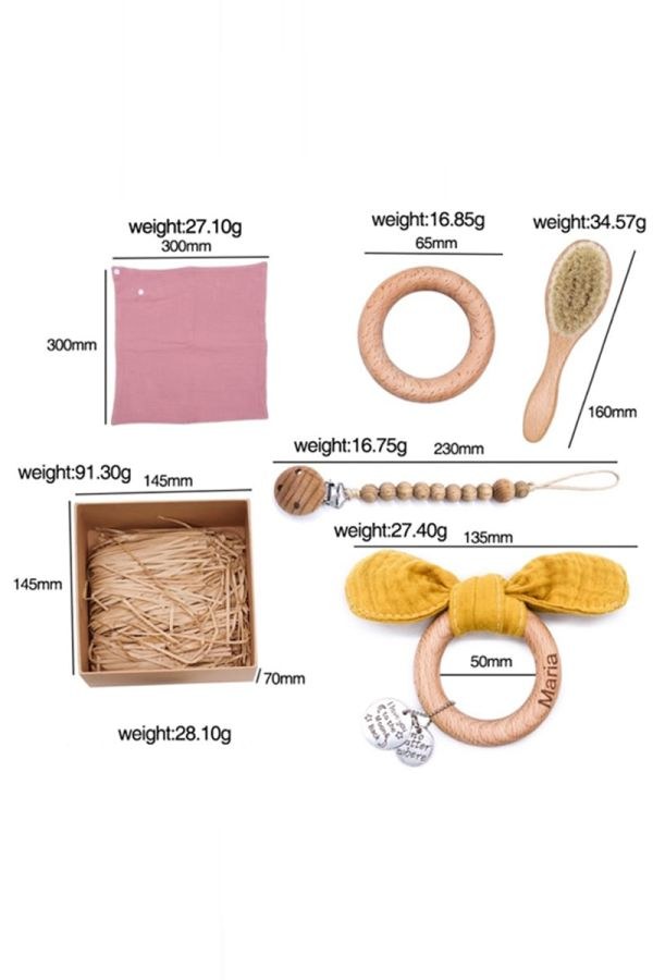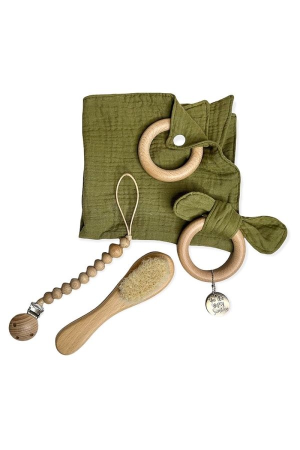 Σετ για το μωρό μέσα σε σκληρό κουτάκι που περιλαμβάνει: βούρτσα μαλακή για τα μαλλάκια του, μασητικό με κρεμαστό "you are my sunshine" το οποίο είναι αποσπώμενο, κλιπ για την πιπίλα ξύλινο & πετσετούλα ώμου με κουμπάκι για την πέψη του.