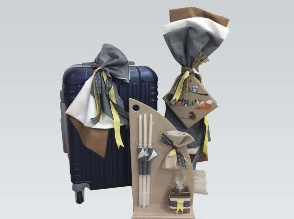 Χειροποίητο σετ βάπτισης που περιλαμβάνει βαλίτσα στολισμένη με θέμα βάπτισης τα ζωάκια, λαμπάδα με ύφασμα και λαδοσέτ.