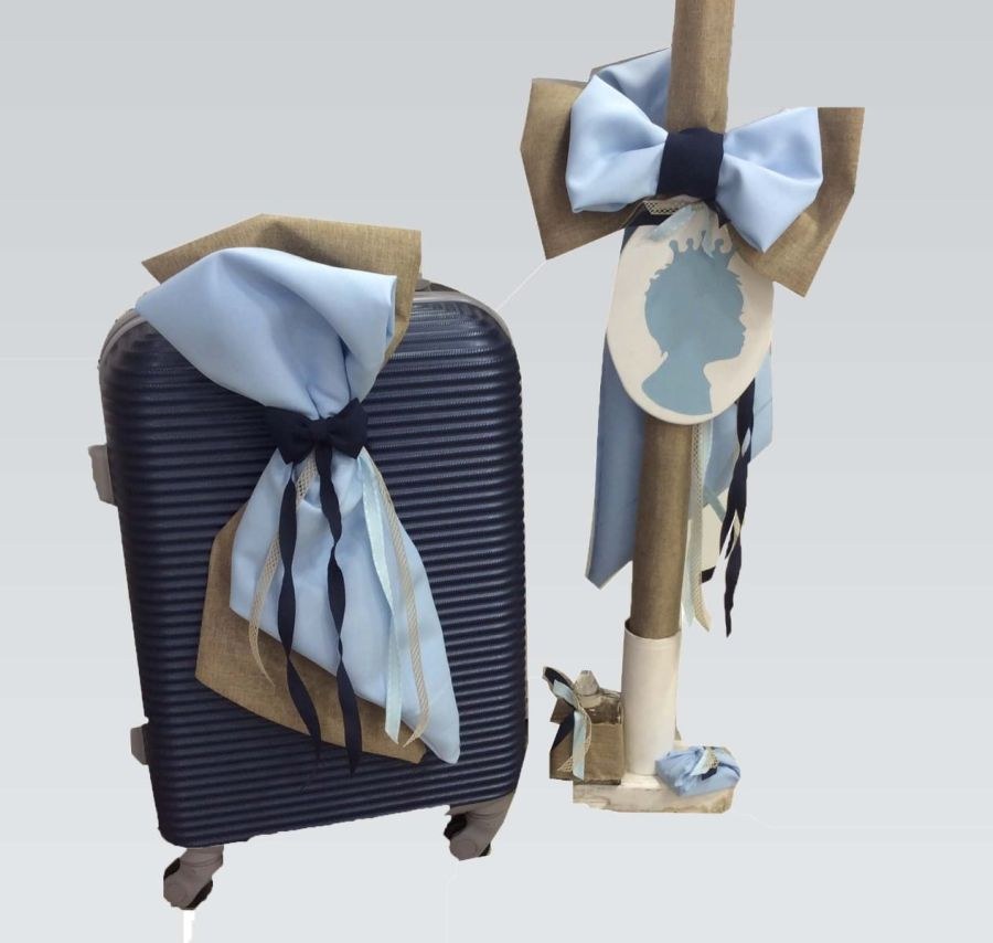 Σετ βάπτισης που περιλαμβάνει βαλίτσα στολισμένη, λαμπάδα και λαδοσετ.