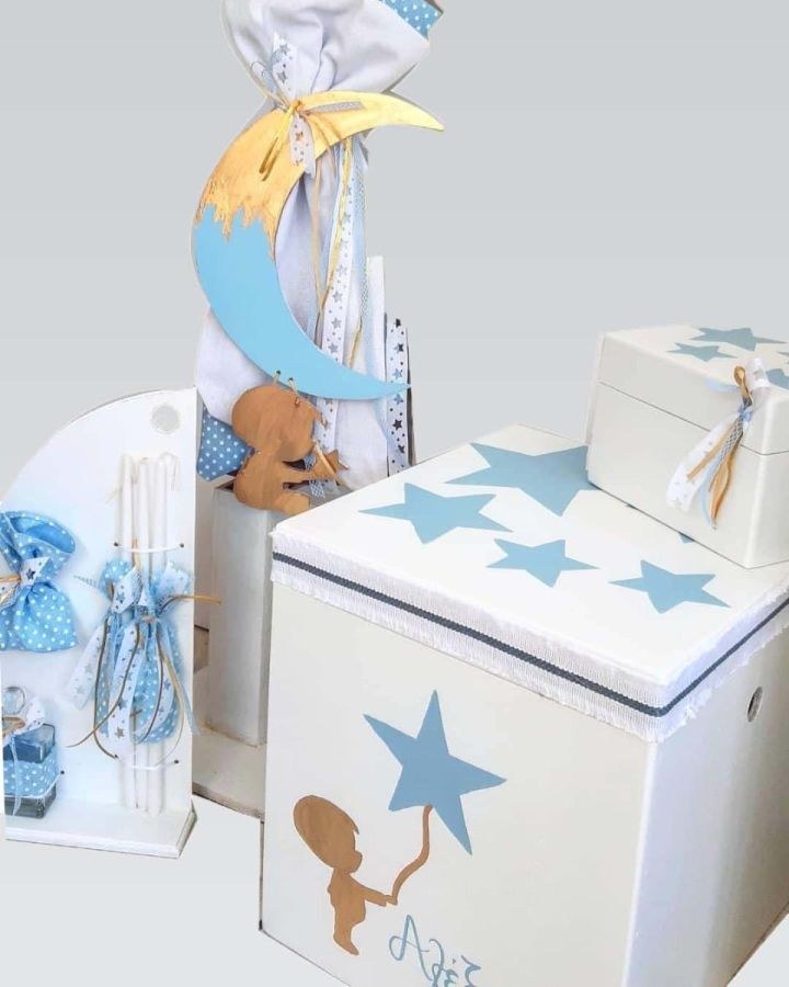 Χειροποίητο σετ βάπτισης που περιλαμβάνει κουτί ζωγραφισμένο με θέμα τα αστέρια, λαμπάδα με ξύλινο καδράκι και λαδοσέτ.